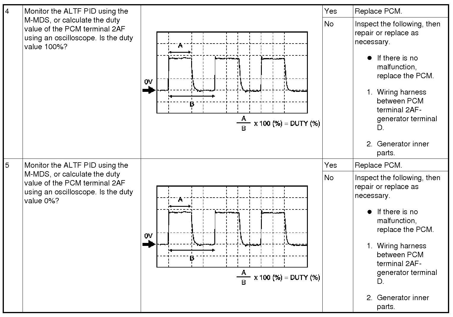 If the generator field coil duty value does not change when electrical loads (such as headlights, blower motor, rear window defroster, brake lights) are on or off, inspection with discharged battery is needed.