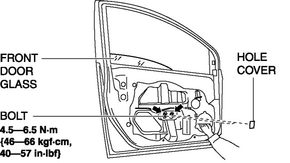 - If the bolts are removed without supporting the front door glass, the front door glass may fall off and be damaged. Remove the bolts while inserting your hand into the front door speaker installation hole to support the front door glass.