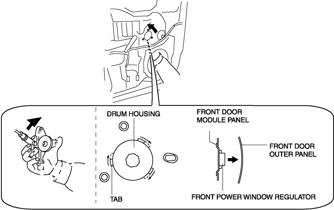 5. Insert a hand through the front door speaker installation hole and rotate the drum housing in the direction of the arrow shown in the figure to detach the tabs from the front door module panel.