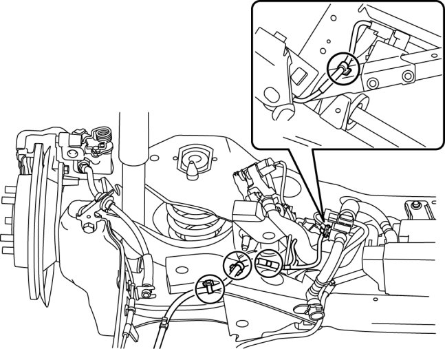 - Performing the following procedures without first removing the ABS wheel-speed sensor may possibly cause an open circuit in the wiring harness if it is pulled by mistake. Before performing the following procedures, disconnect the ABS wheel-speed sensor wiring harness connector (axle side) and fix the wiring harness to an appropriate place where it will not be pulled by mistake while servicing the vehicle.