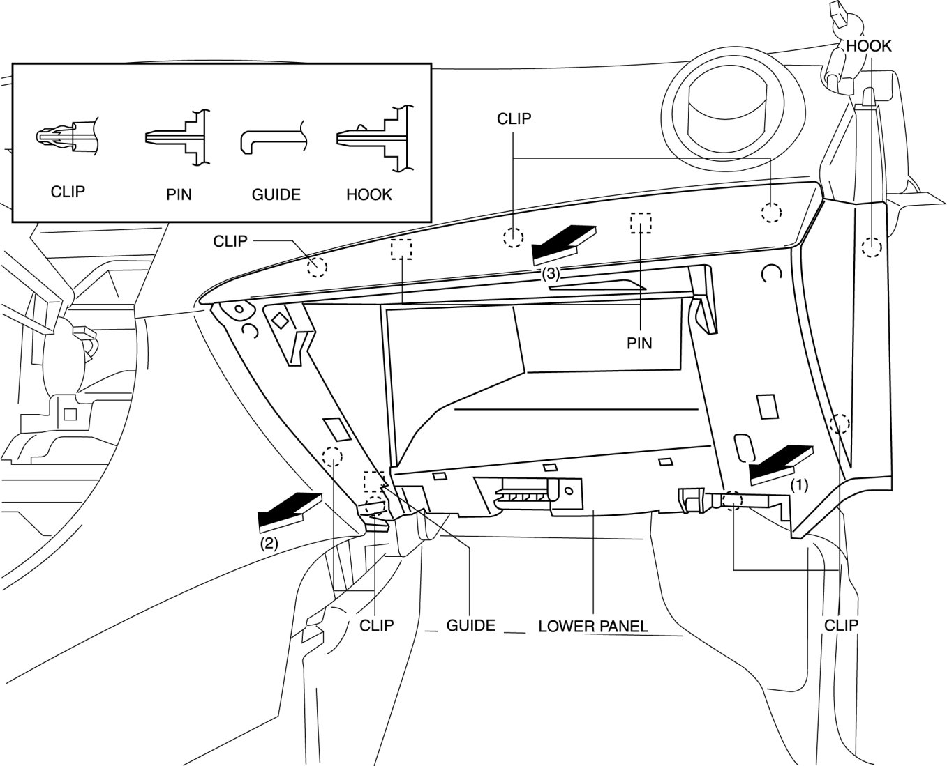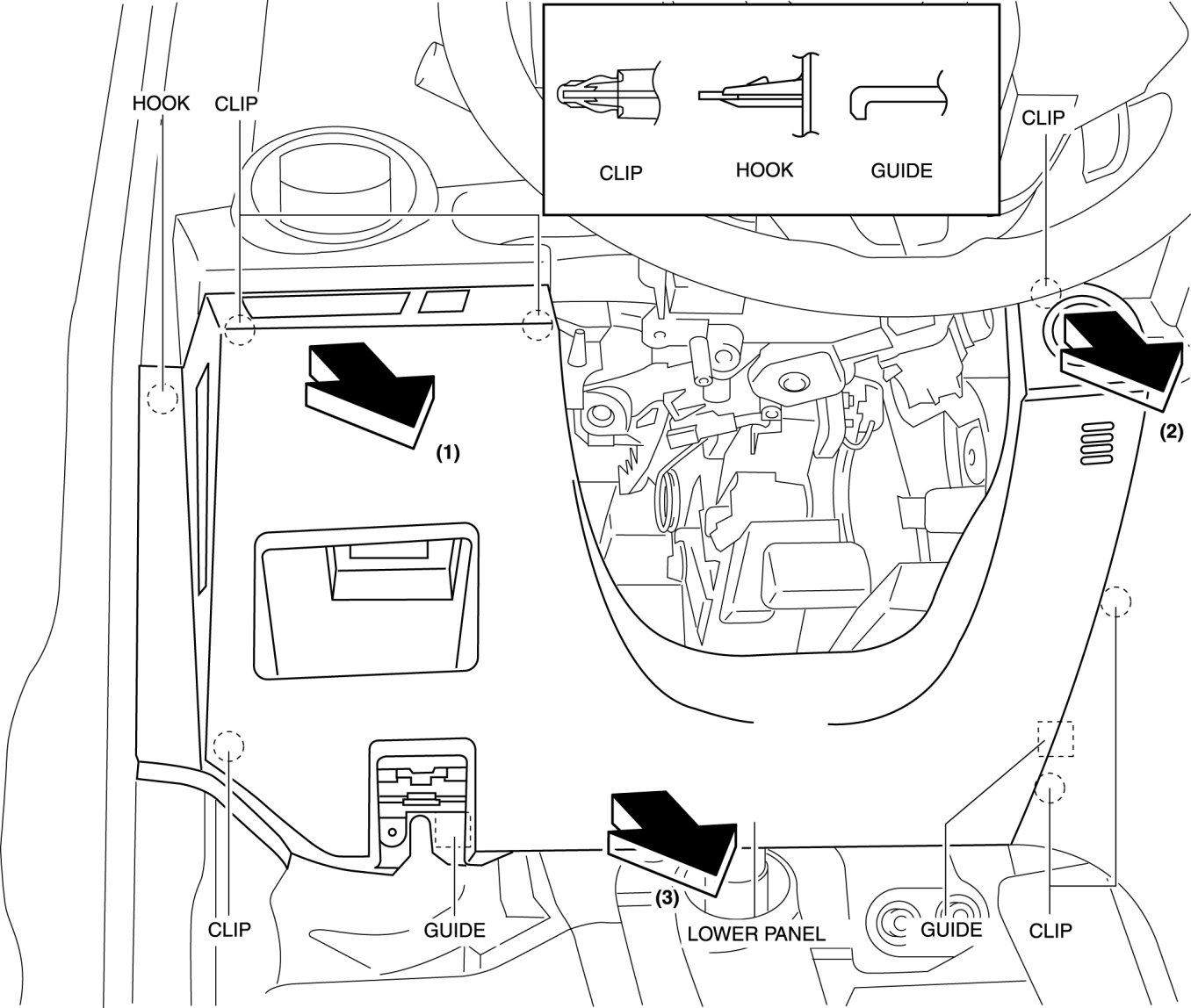 4. Pull the lower panel in the direction of the arrow in the order of (1) (2), (3) and remove the lower panel while detaching the hook, clips, guide and pins.