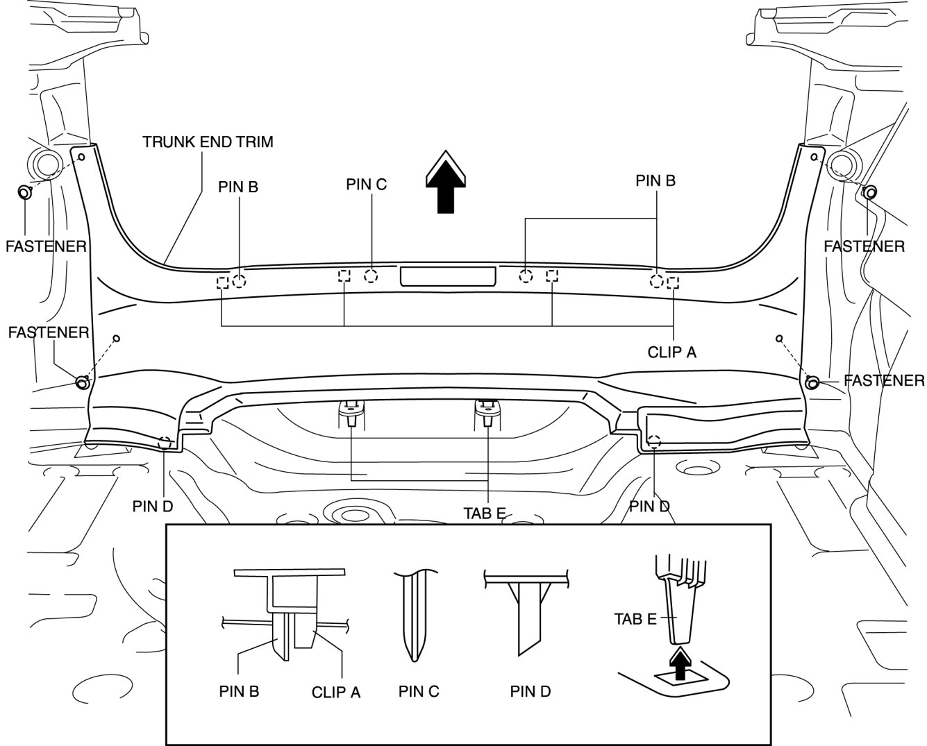 4. Pull the trunk end trim indicated in the arrow shown in the figure, then detach clips A, pins B, pin C, D and tabs E.