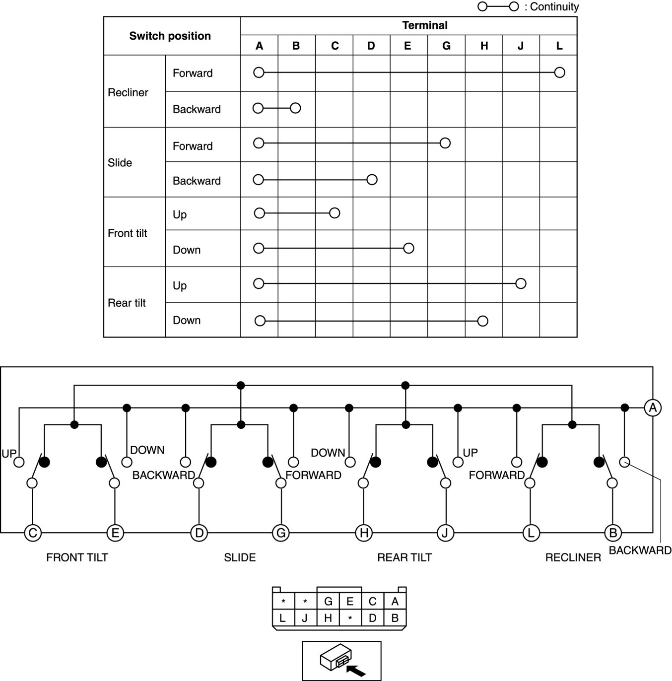 2. Inspect for continuity between the power seat switch connector terminals using an ohmmeter.