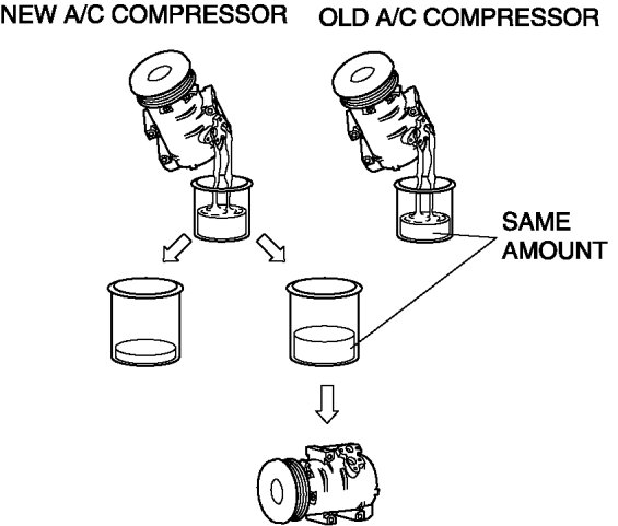 1. Rotate new A/C compressor shaft six to eight revolutions while collecting refrigerant oil in a clean measuring device. Use this refrigerant oil to refill new compressor. Do not allow refrigerant oil to become contaminated.