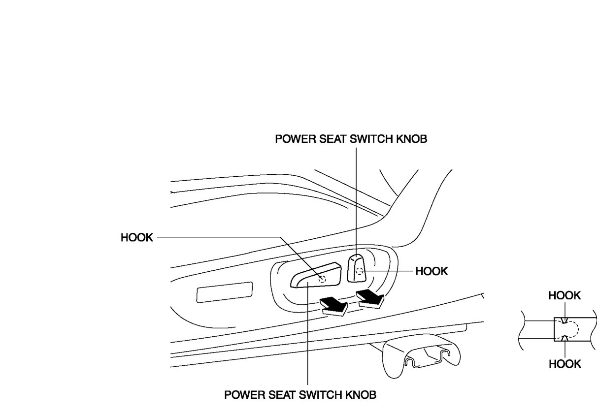 5. Pull the power seat switch knobs in the direction of arrow, while remove the hook.