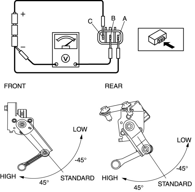 4. Connect auto leveling sensor terminal A to the battery's minus terminal, and terminal C to the battery's plus terminal, and apply 4.5 V of voltage between terminals A and C.