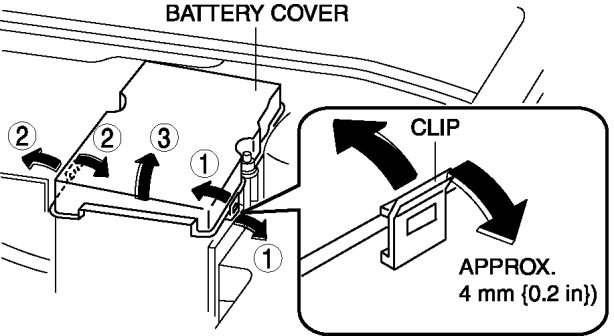 a. Pull the clip (LH) in the outward direction approx.4 mm {0.2 in} and disengage the battery cover tabs.