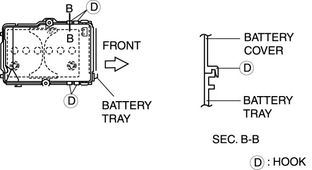 2. Install with battery cover hooks D aligned with the battery tray flange at four points.