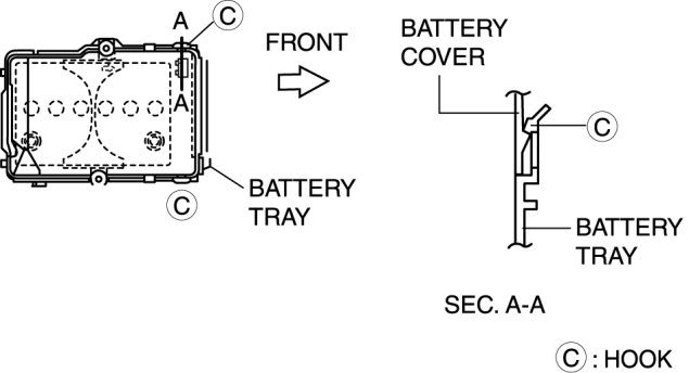 3. Set the battery cover to battery tray hooks C at two points.