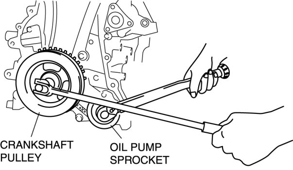 1. Temporarily install the crankshaft pulley and crankshaft pulley lock bolt to the crankshaft, and lock the oil pump against rotation as shown in figure.