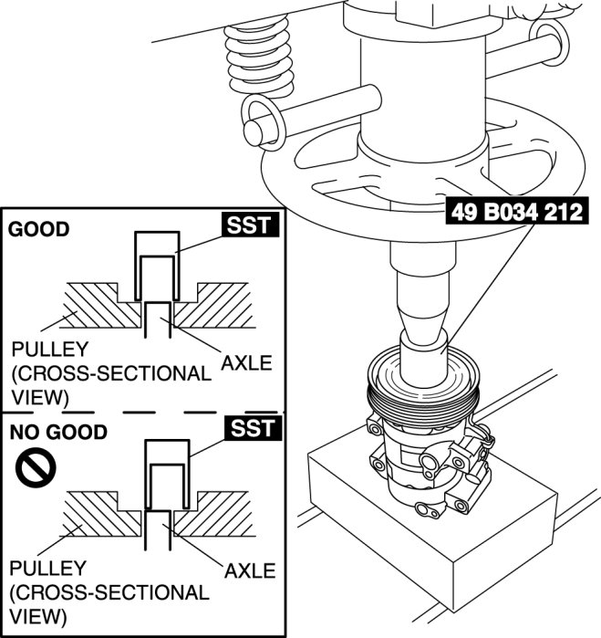 - If the SST is not properly positioned when the A/C compressor pulley is press-fit, the A/C compressor axle will interfere with the SST, possibly damaging component parts. Verify the SST and axle are properly positioned and perform the procedure very carefully.
