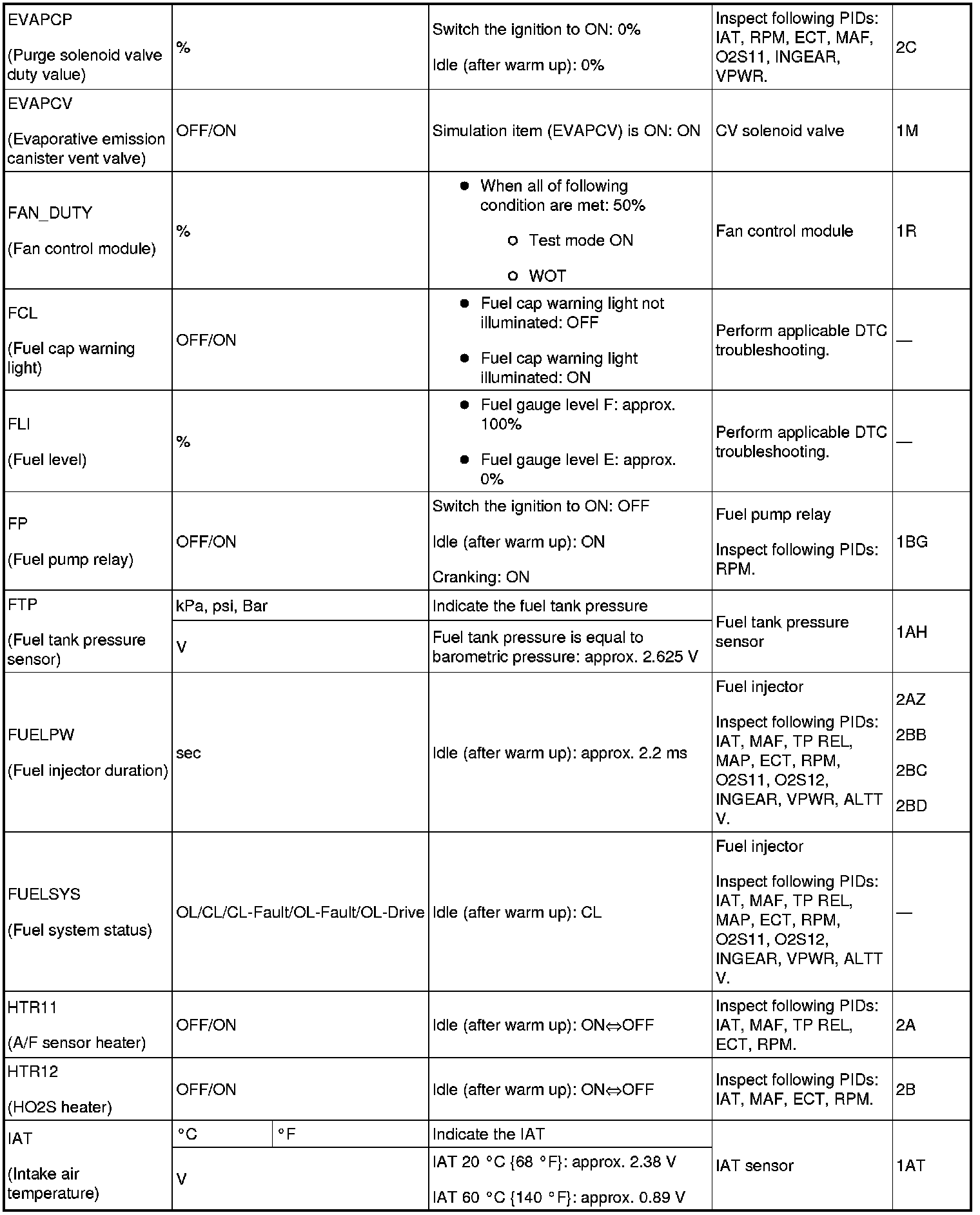 - ACCS, ALTF, ARPMDES, EVAPCP, EVAPCV, FAN_DUTY, FP, HTR11, IMRC, IMTV, INJ_1~4, SEGRP, Test, VT Duty1 wt