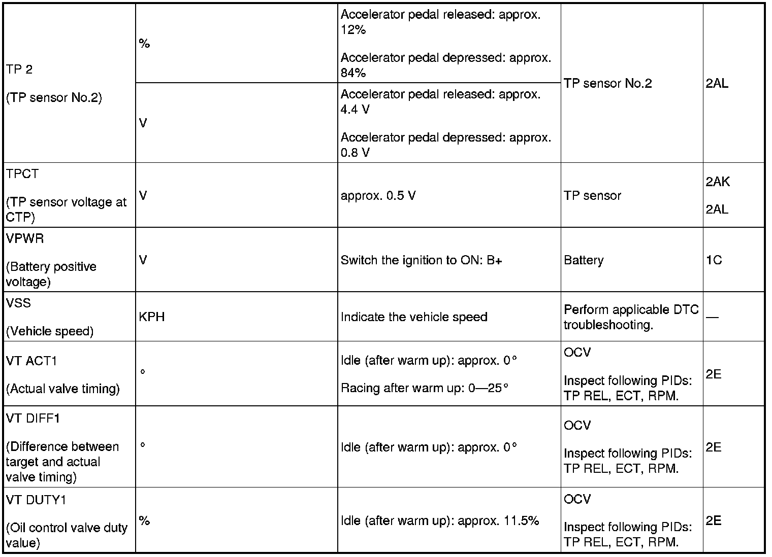 - If PID value is not within the specification, follow the instructions in Action column.