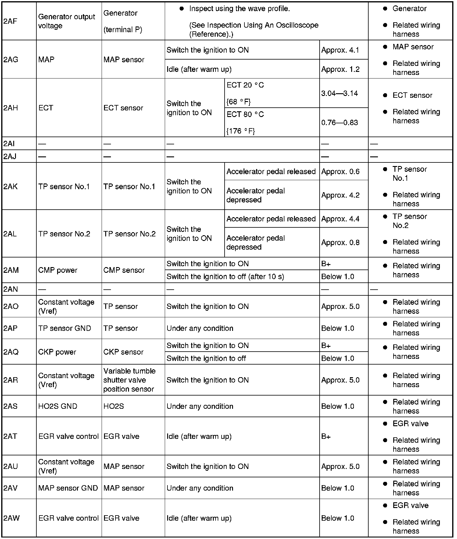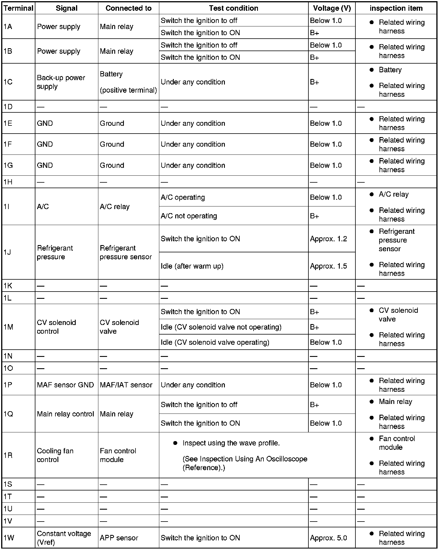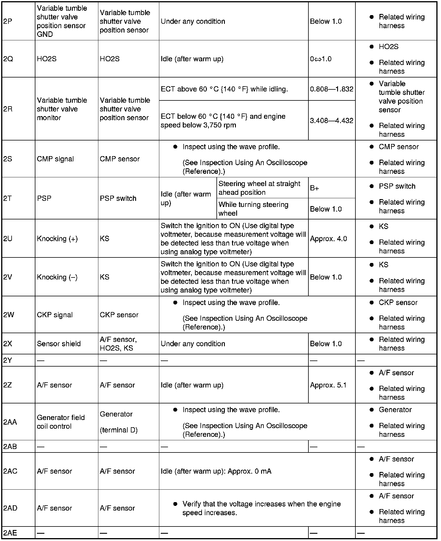 - The PCM terminal voltages vary with change in measuring conditions and vehicle conditions. Always carry out a total inspection of the input systems, output systems, and PCM to determine the cause of trouble. Otherwise, a wrong diagnosis will be made.