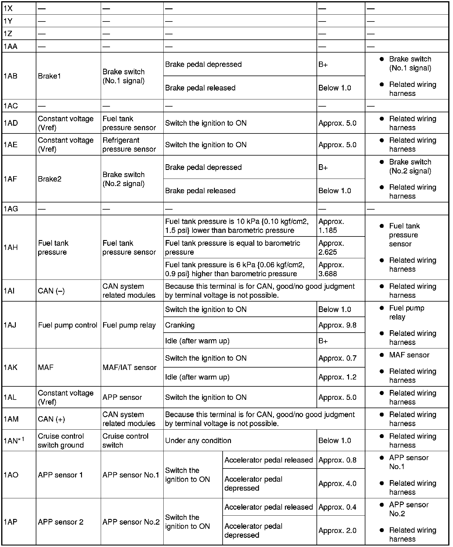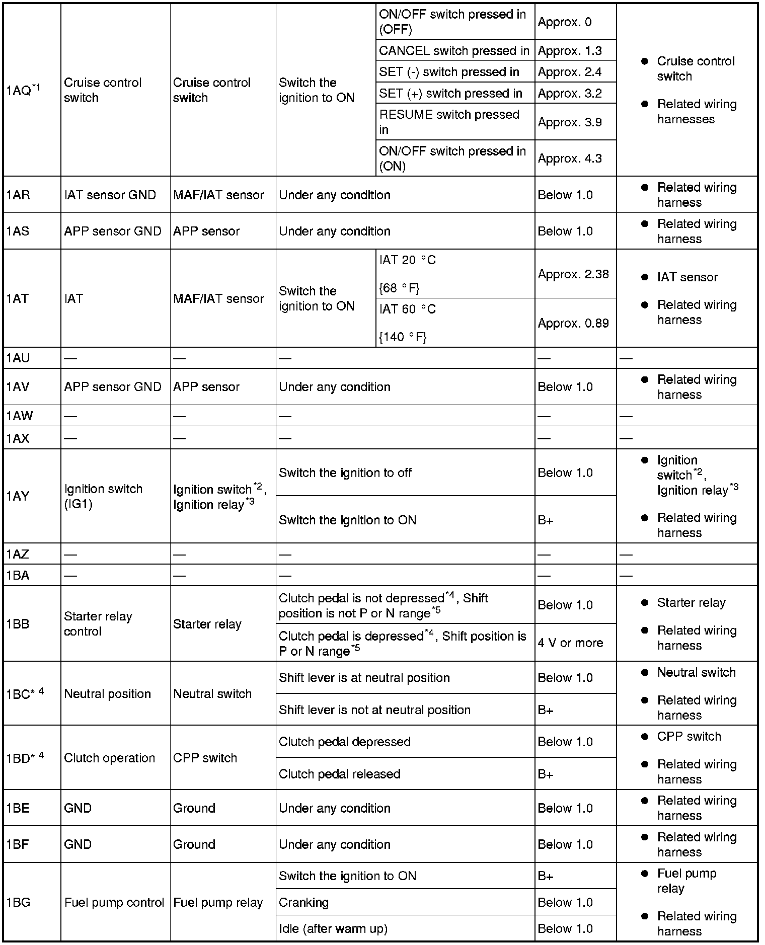 - If any incorrect voltage is detected, inspect the related system(s), wiring harnesses and connector(s) referring to the Action column in the terminal voltage table.