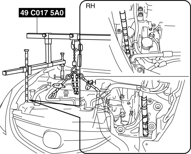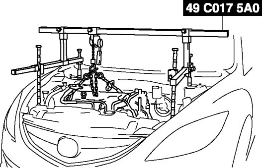 1. Adjust the SST (49 C017 5A0) and lean the engine toward the transaxle.