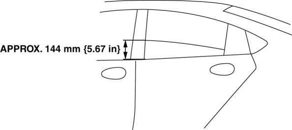 1. To access the glass installation bolt, position the rear door glass so that the distance from the top of the rear door glass to the upper part of the rear beltline molding is approx. 144 mm {5.67 in}.