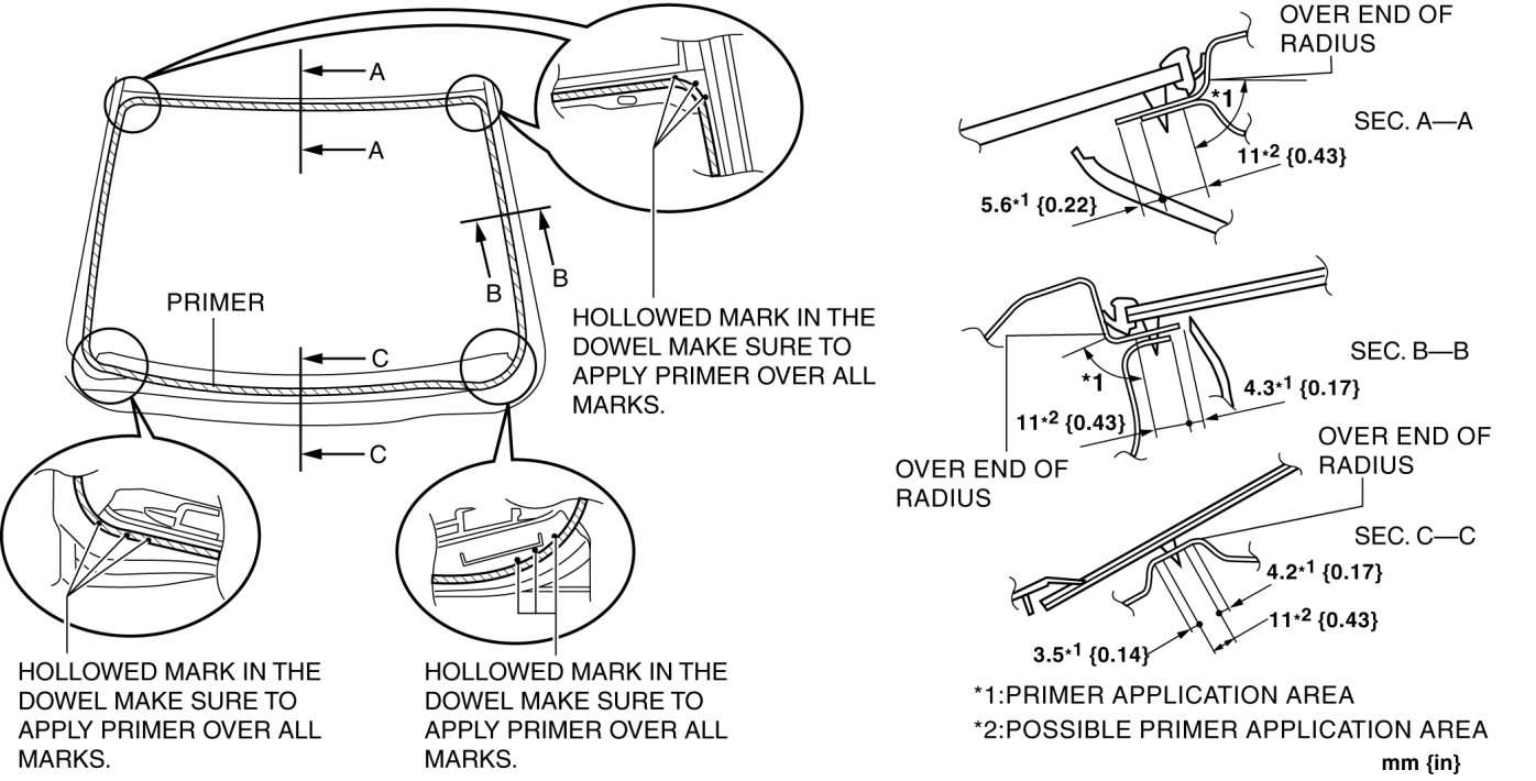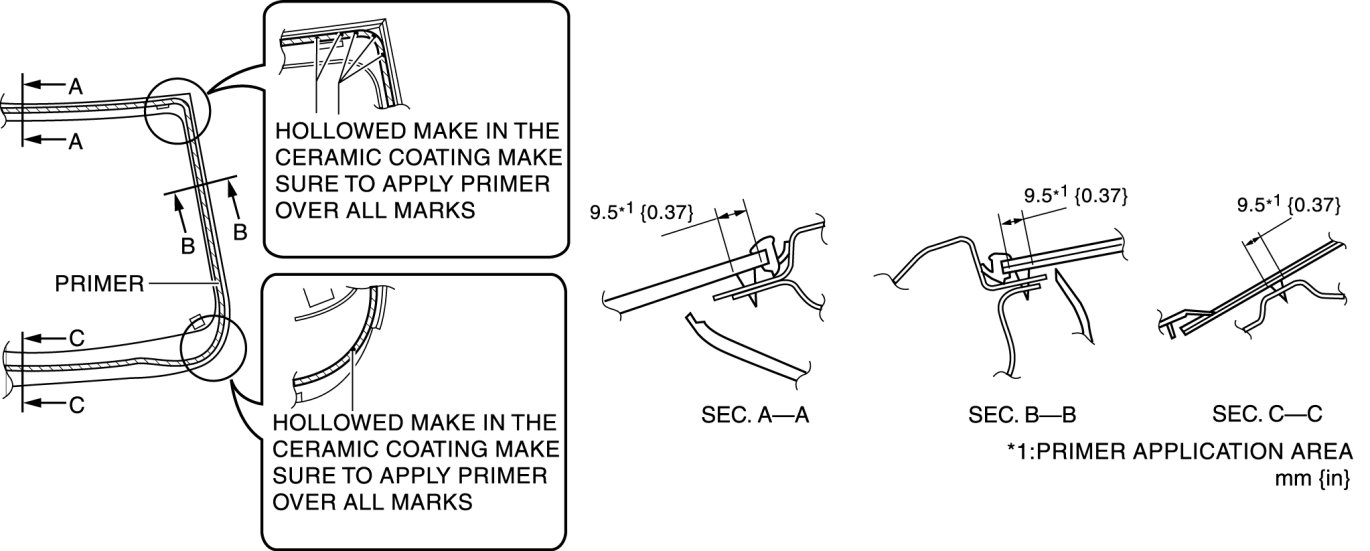 8. If the sealant has come off completely in any one place, apply some primer after degreasing, and allow it approx. 30 min. to dry. Then apply 2 mm {0.08 in} thickness of new sealant.