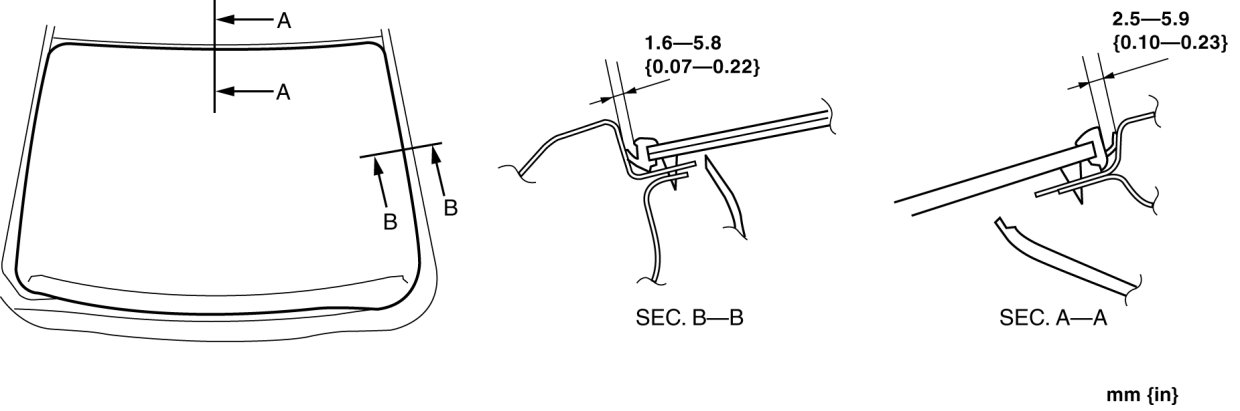 13. Verify that the clearance between the A-pillar and the roof is within the range shown in the figure, and press along the perimeter of the glass.
