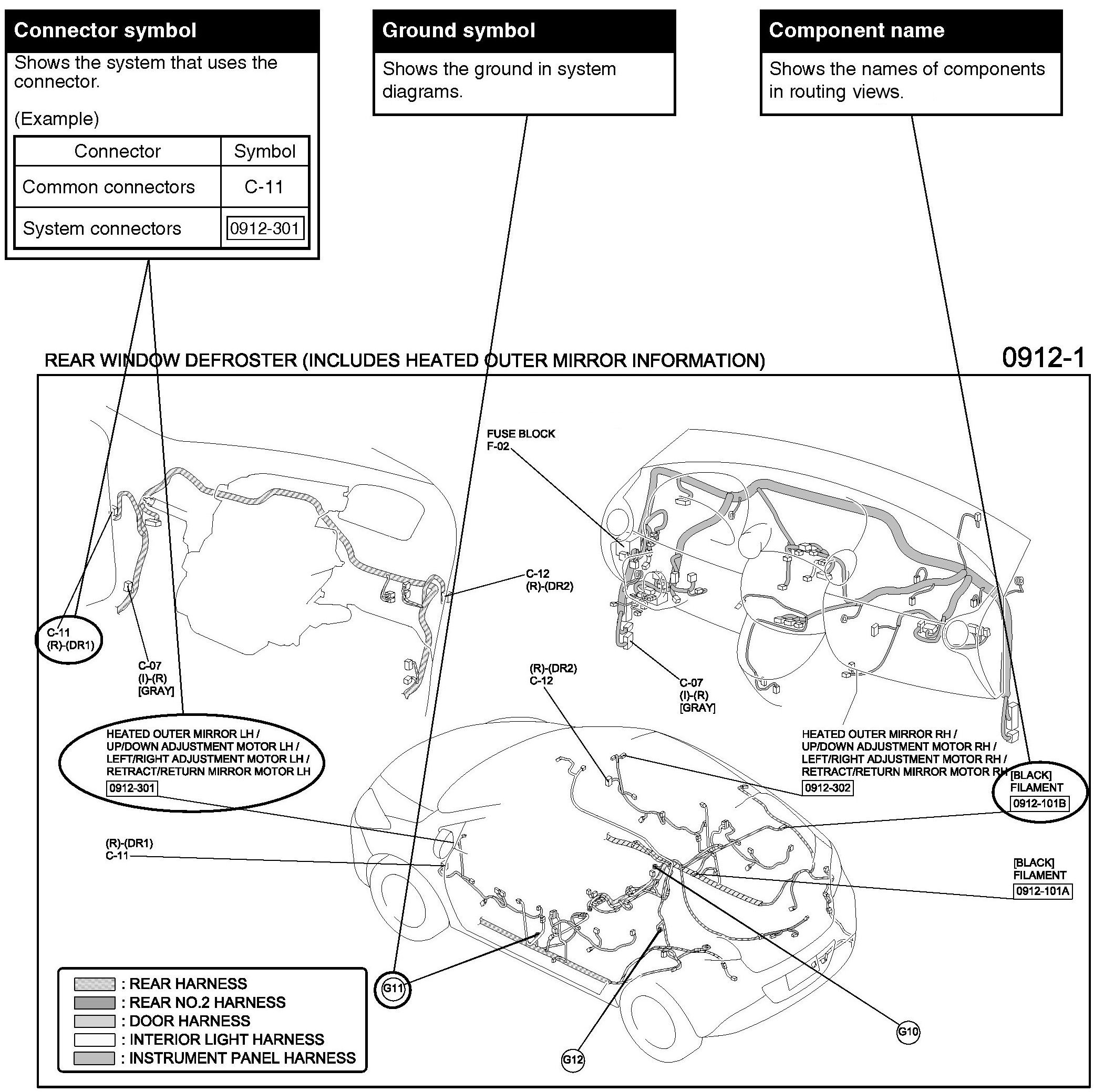 The routing view shows where electrical components are on the system circuit diagram by call out line and connector symbols.