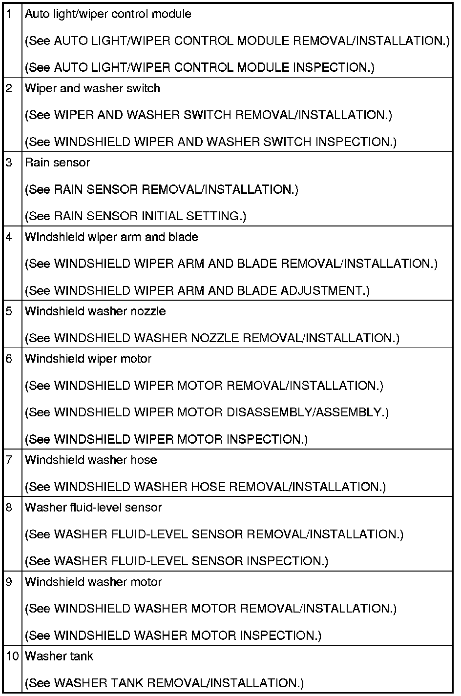 WIPER/WASHER SYSTEM LOCATION INDEX
