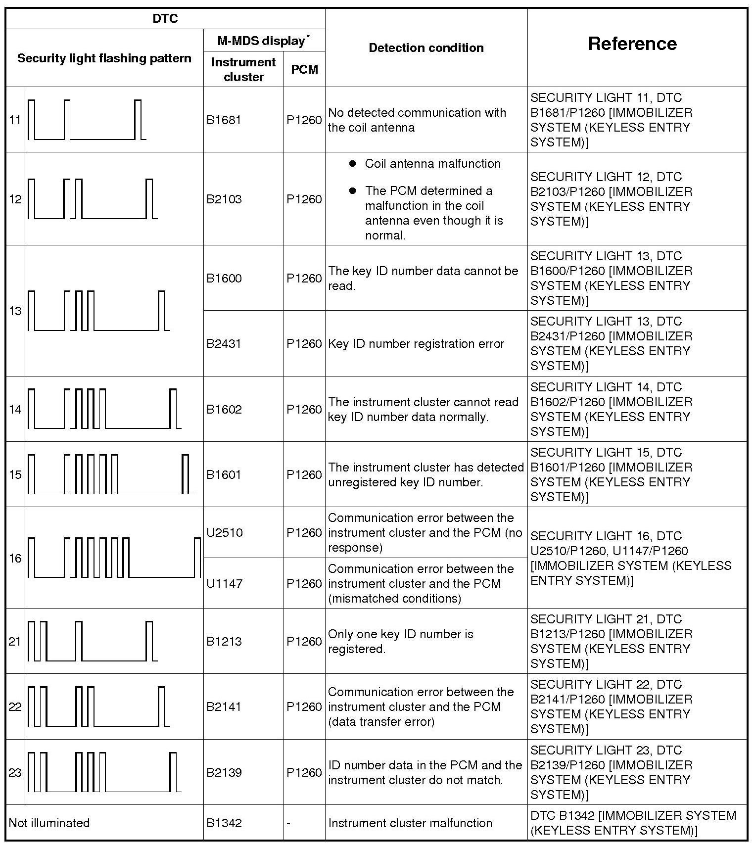 Immobilizer System (Keyless Entry System) - DTC Table
