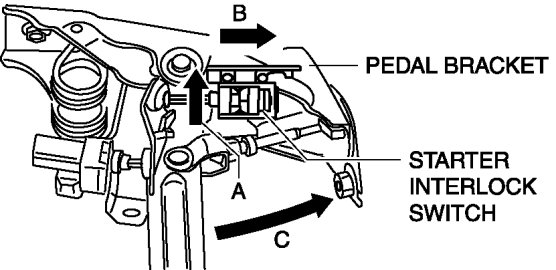 3. Fully depress the clutch pedal in the direction of arrow C, and verify that a click sound from the starter interlock switch is heard.