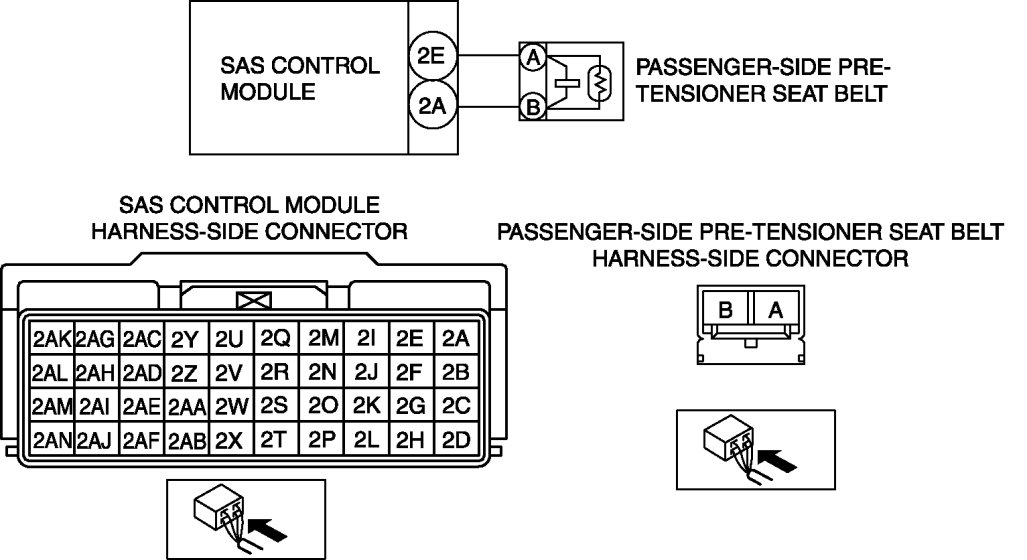 - Open or short circuit or short to ground or short to power supply in the wiring harness between the passenger-side pre-tensioner seat belt and SAS control module