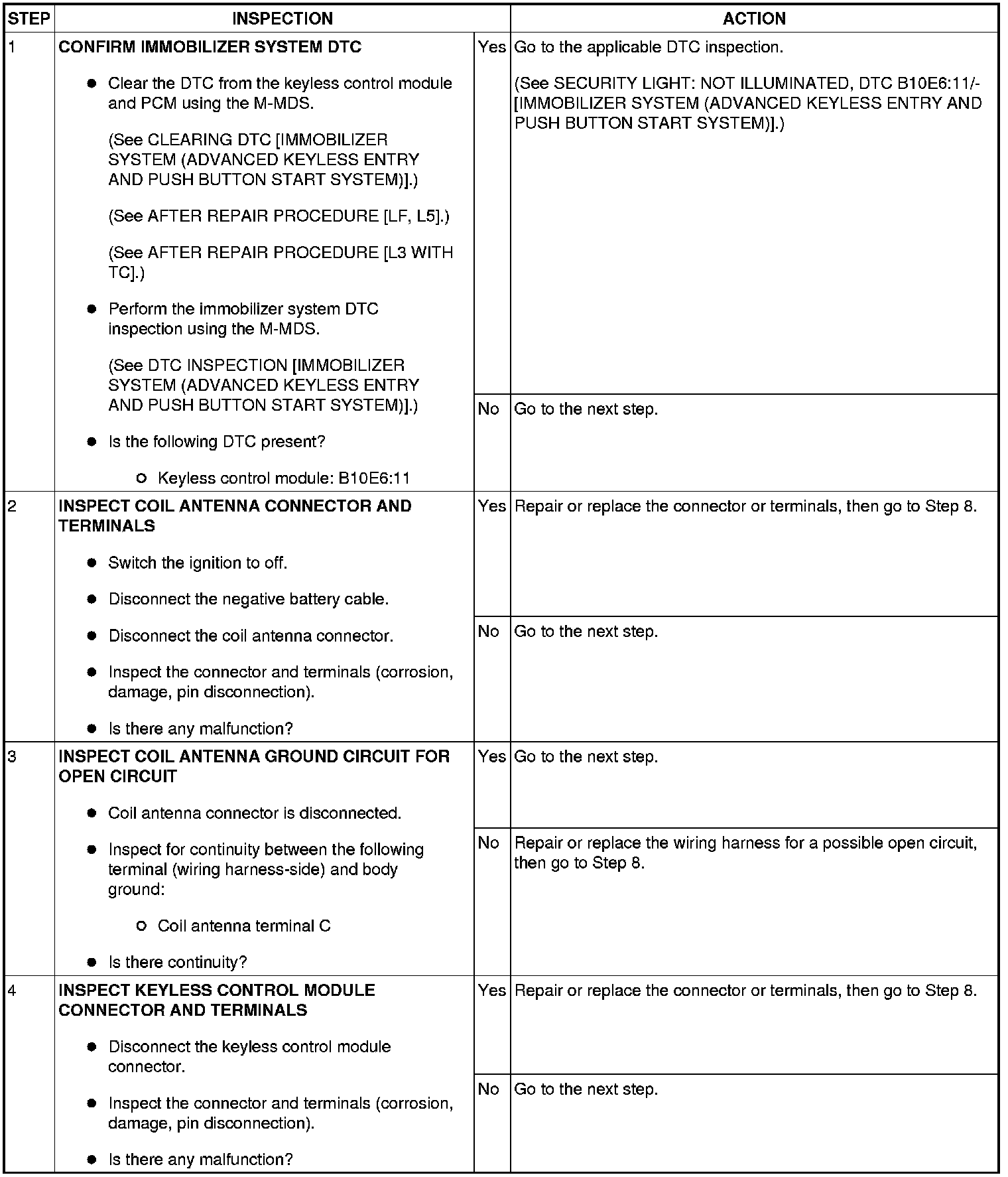SECURITY LIGHT: 11, DTC: B10D9:87/P1260:00 [IMMOBILIZER SYSTEM (ADVANCED KEYLESS ENTRY AND PUSH BUTTON START SYSTEM)]