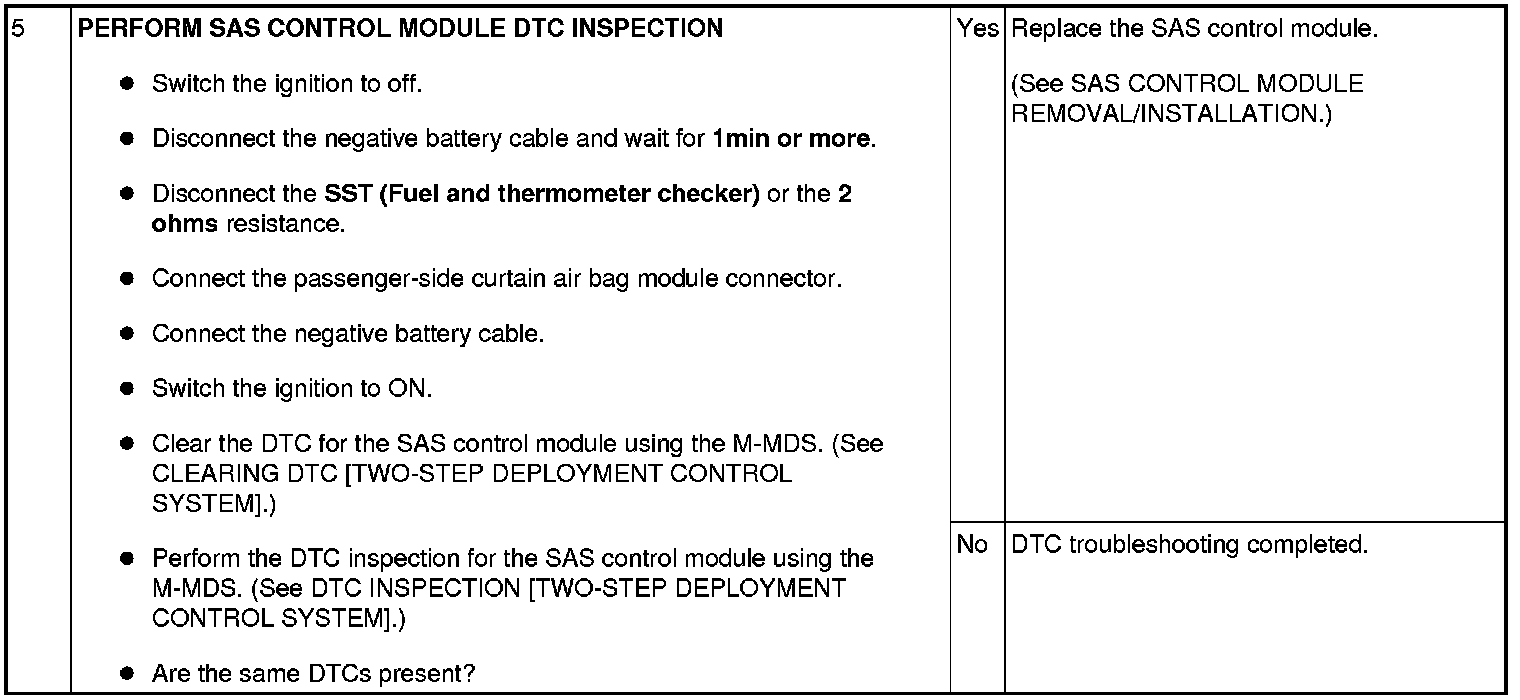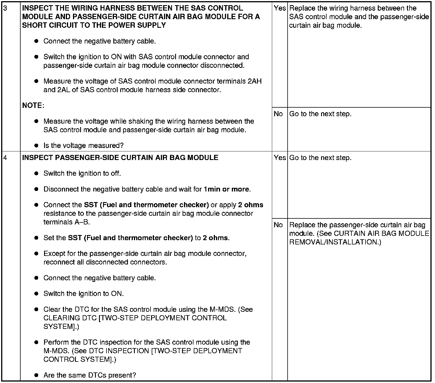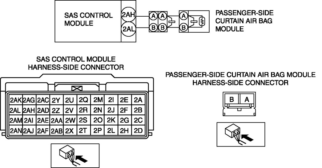 - Open or short circuit or short to ground or short to power supply in the wiring harness between the passenger-side curtain air bag module and SAS control module
