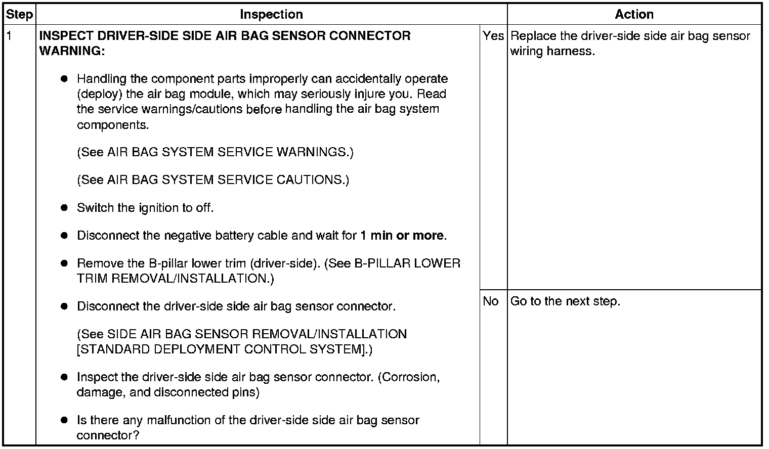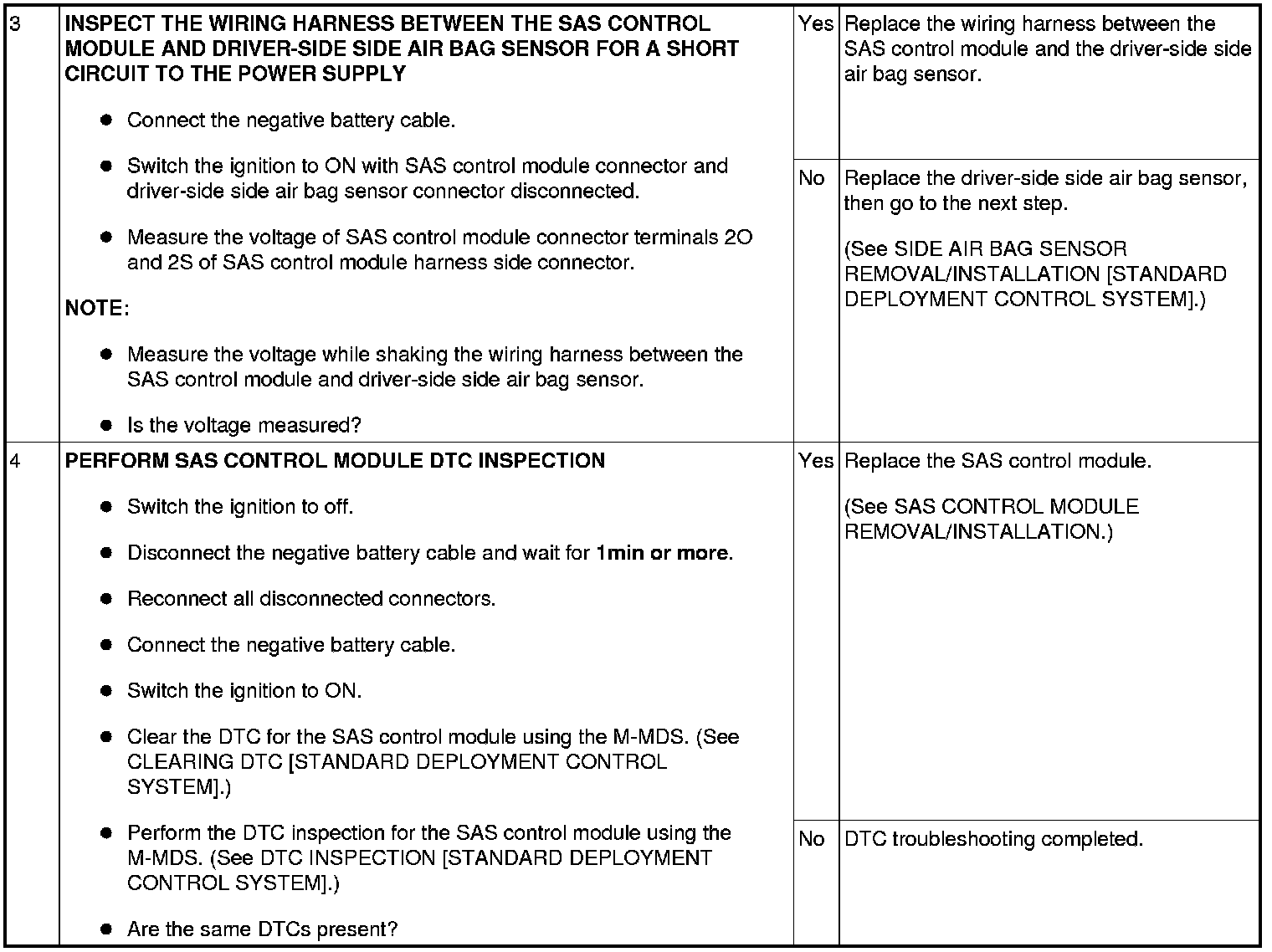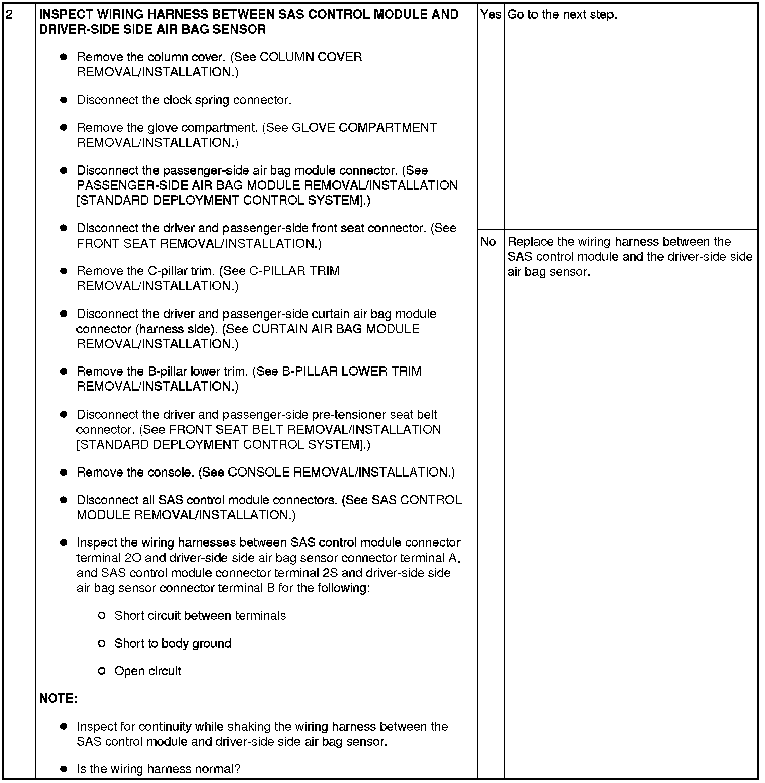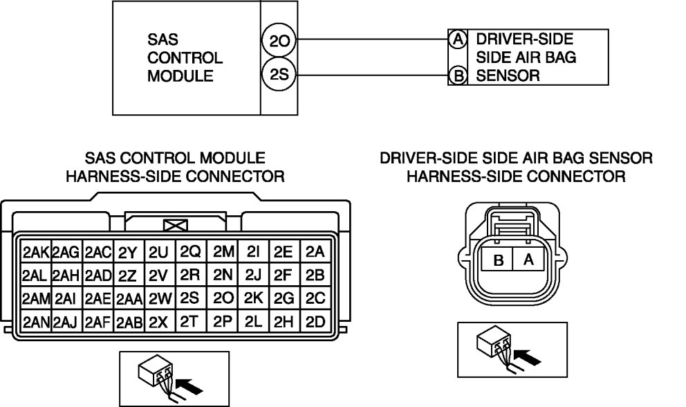 - Open or short circuit or short to ground or short to power supply in the wiring harness between the driver-side side air bag sensor and SAS control module