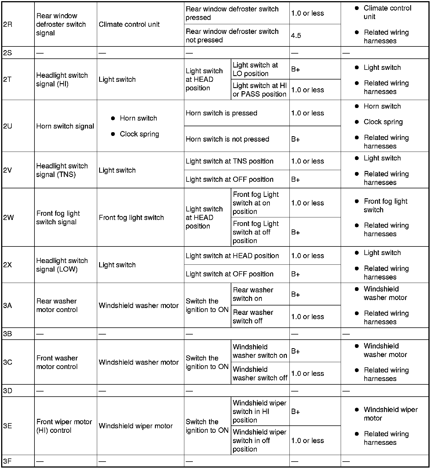 - Rear door switch (LH) signal: 6E (+) -> body ground (-)
