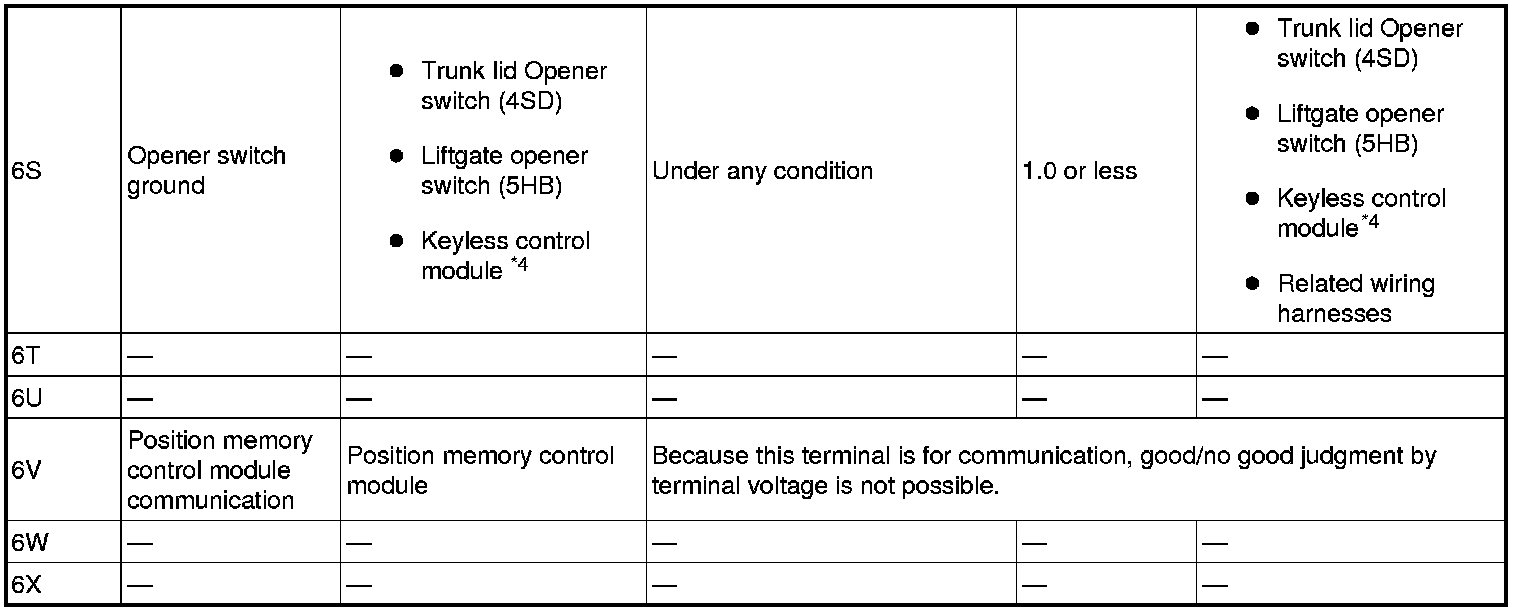 - Lock/unlock input (passenger-side door lock-link switch) (rear door lock link switch (RH, LH)): 6J (+) -> body ground (-)