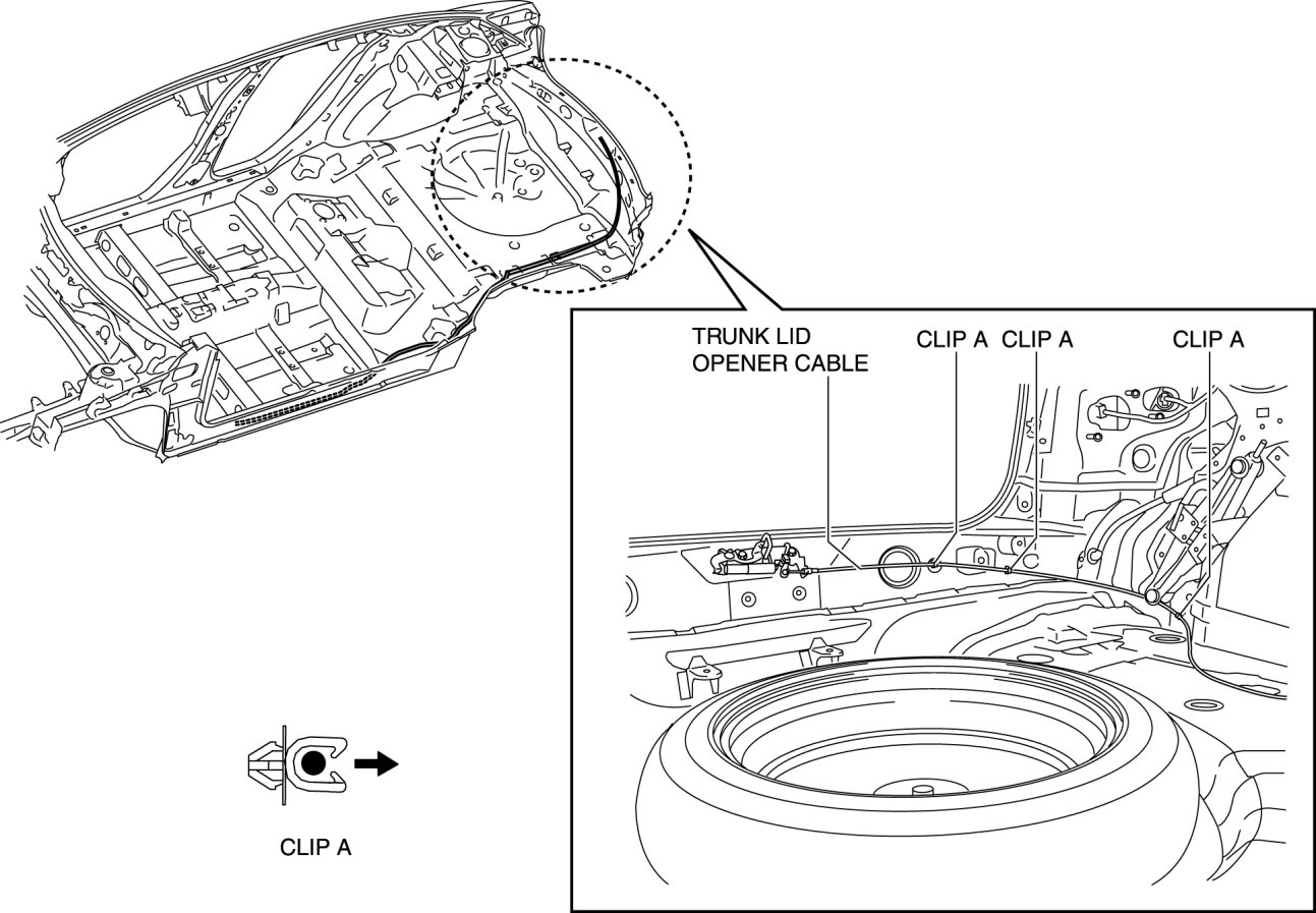 6. Remove the trunk lid opener cable from clips A.