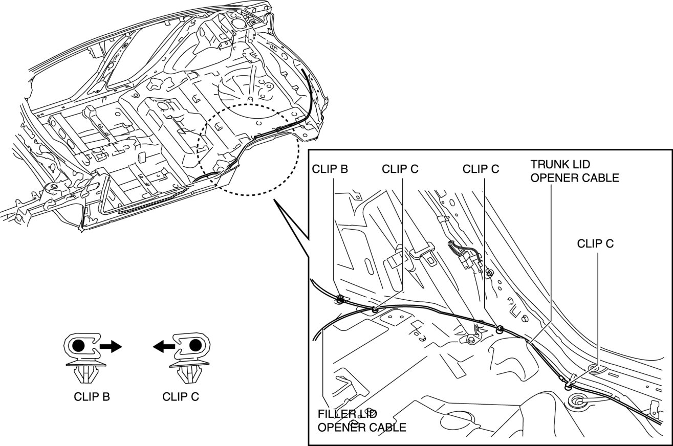 7. Remove the trunk lid opener cable from clips B and C.