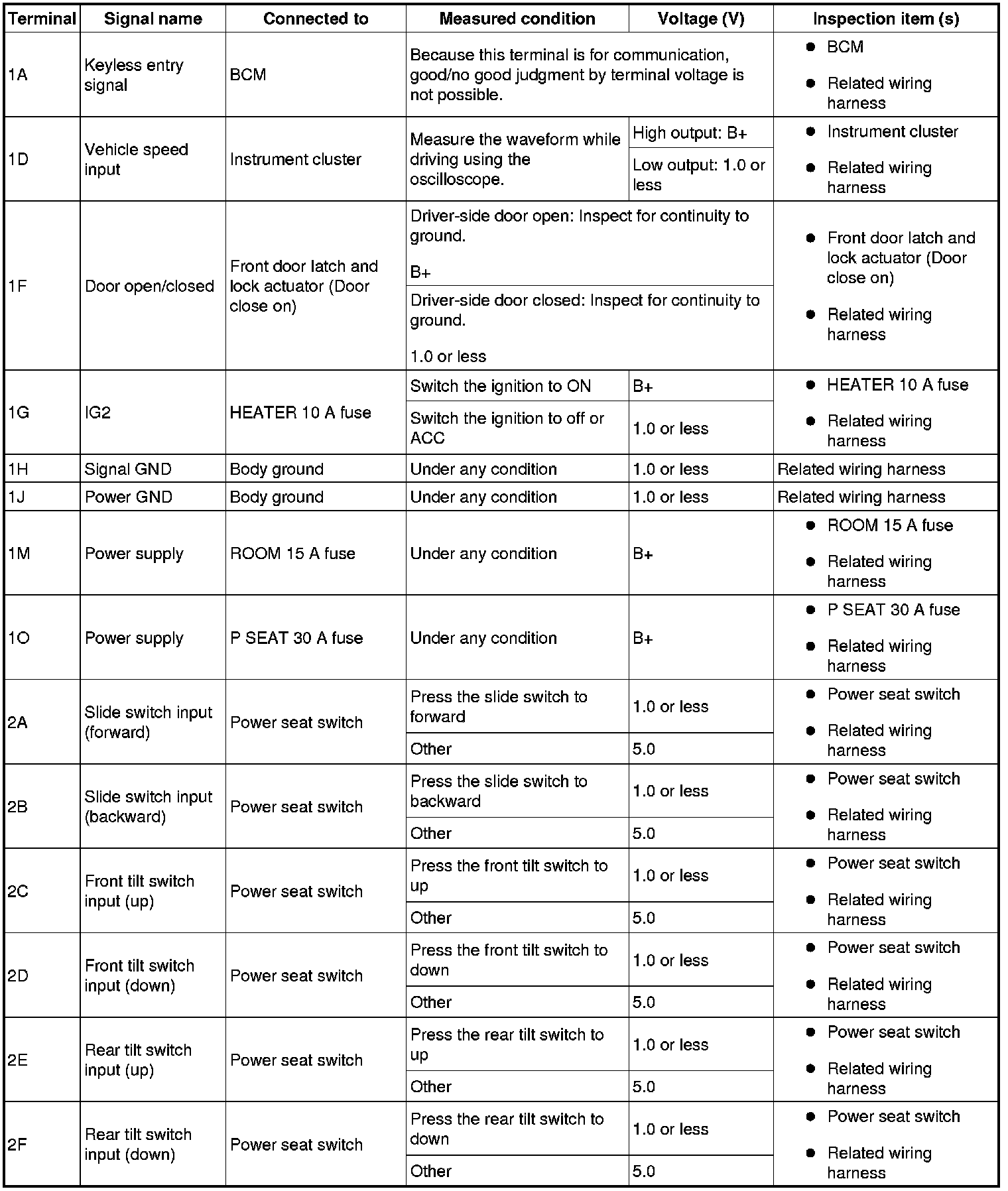 - If the voltage is not as specified in the Terminal Voltage Table (Reference), inspect the parts under "Inspection item (s)" and related wiring harnesses.