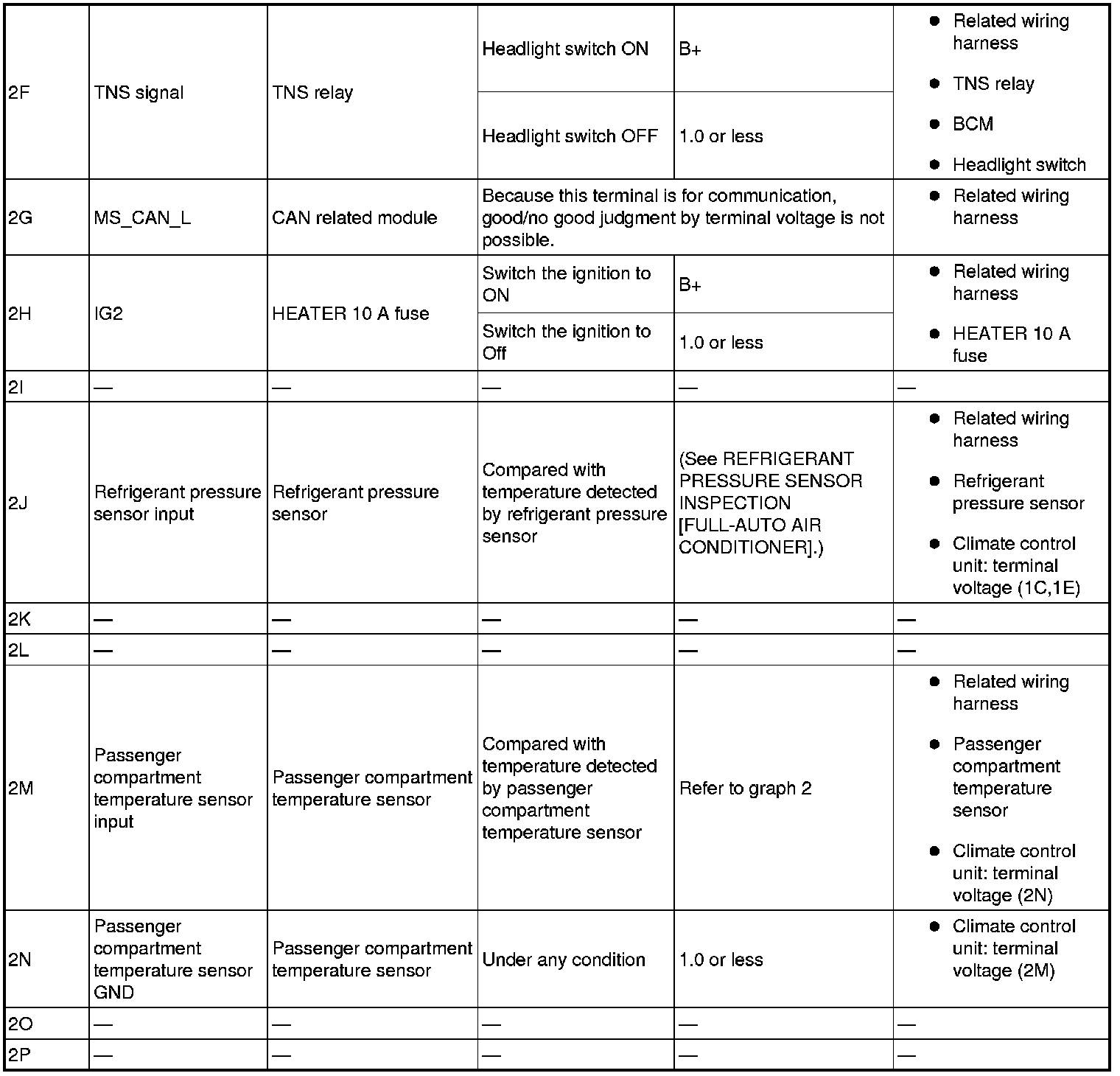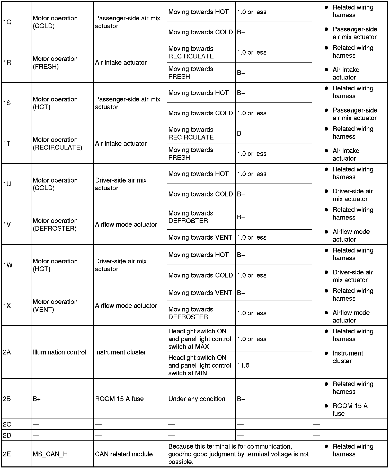 - If the parts under "Inspection item (s)" are found to be normal (except for terminal 1M), replace the climate control unit.