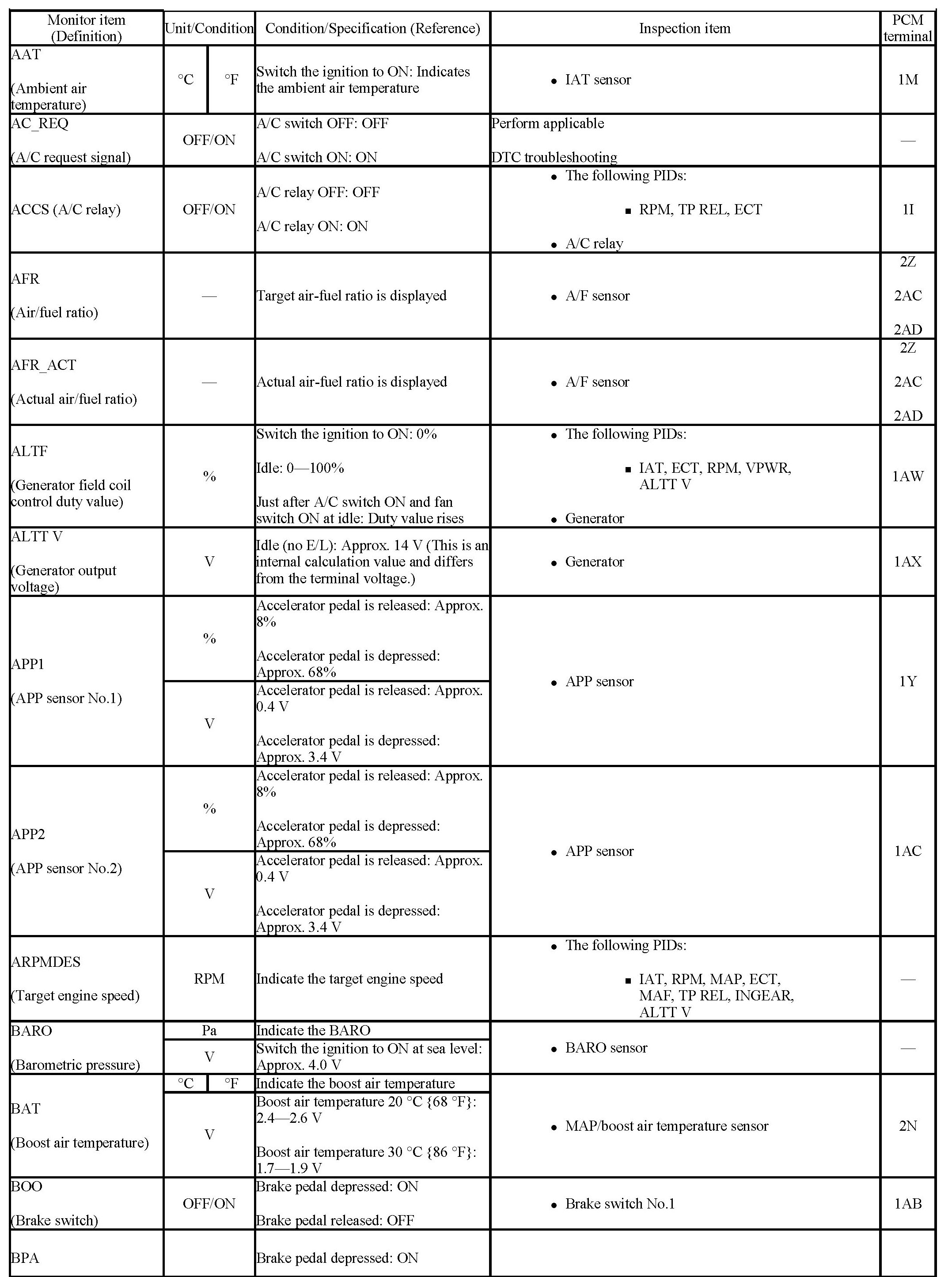 PIDs for the following parts are not available on this model. Perform the specific inspections for the following parts: