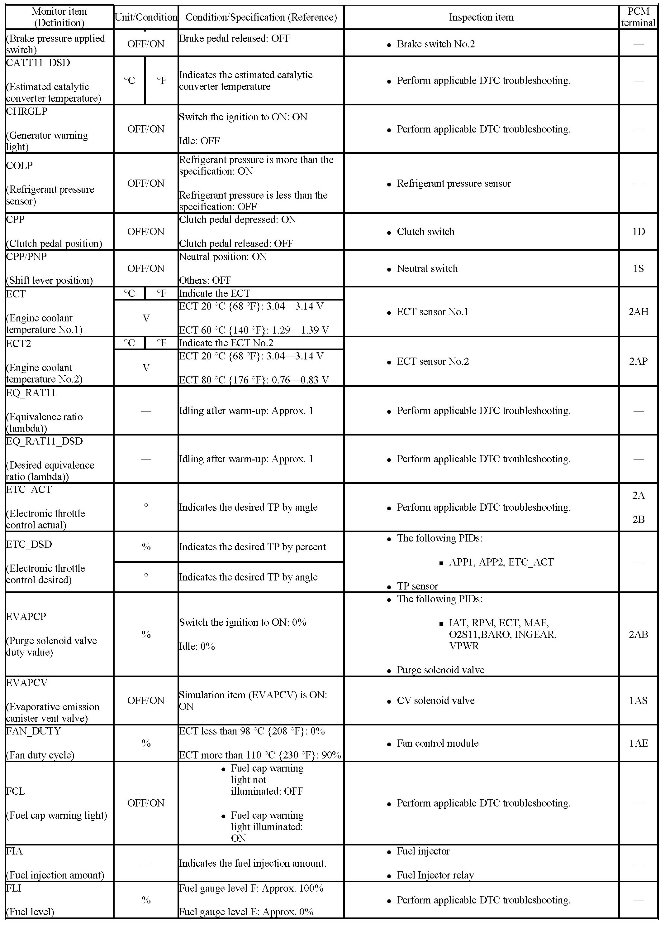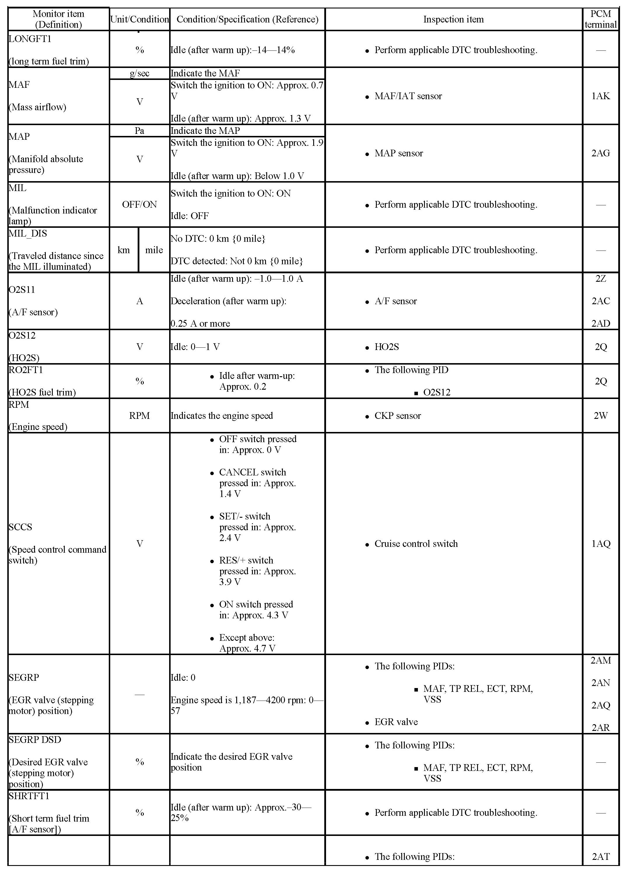 - If PID value is not within the specification, follow the instructions in the "Inspection item" column.