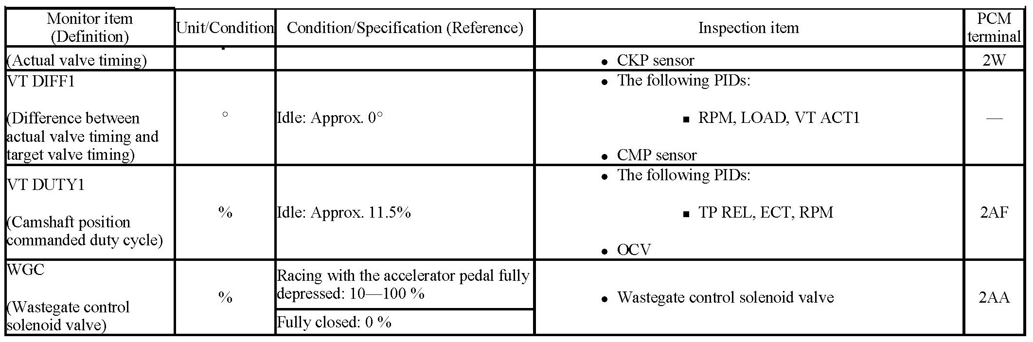 - ACCS, ALTF, ARPMDES, EVAPCP, EVAPCV, FAN_DUTY, FP, IMRC, INJ_1, INJ_2, INJ_3, INJ_4, SEGRP, TEST, VT DUTY1 wt, WGC