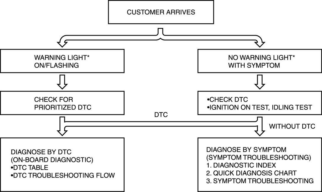 - When the customer reports a vehicle malfunction, check the malfunction indicator lamp (MIL) indication and diagnostic trouble code (DTC), then diagnose the malfunction according to the following flowchart.