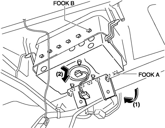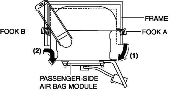 8. Pull the passenger-side air bag module in the direction of arrow (2) and detach the hook B from the instrument panel and remove it.