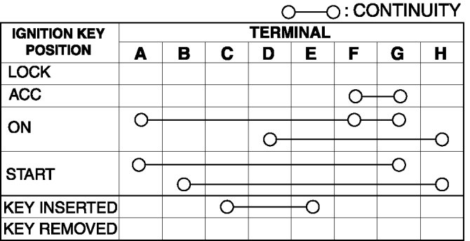 4. Verify that the continuity between the ignition switch terminals is as indicated in the table.