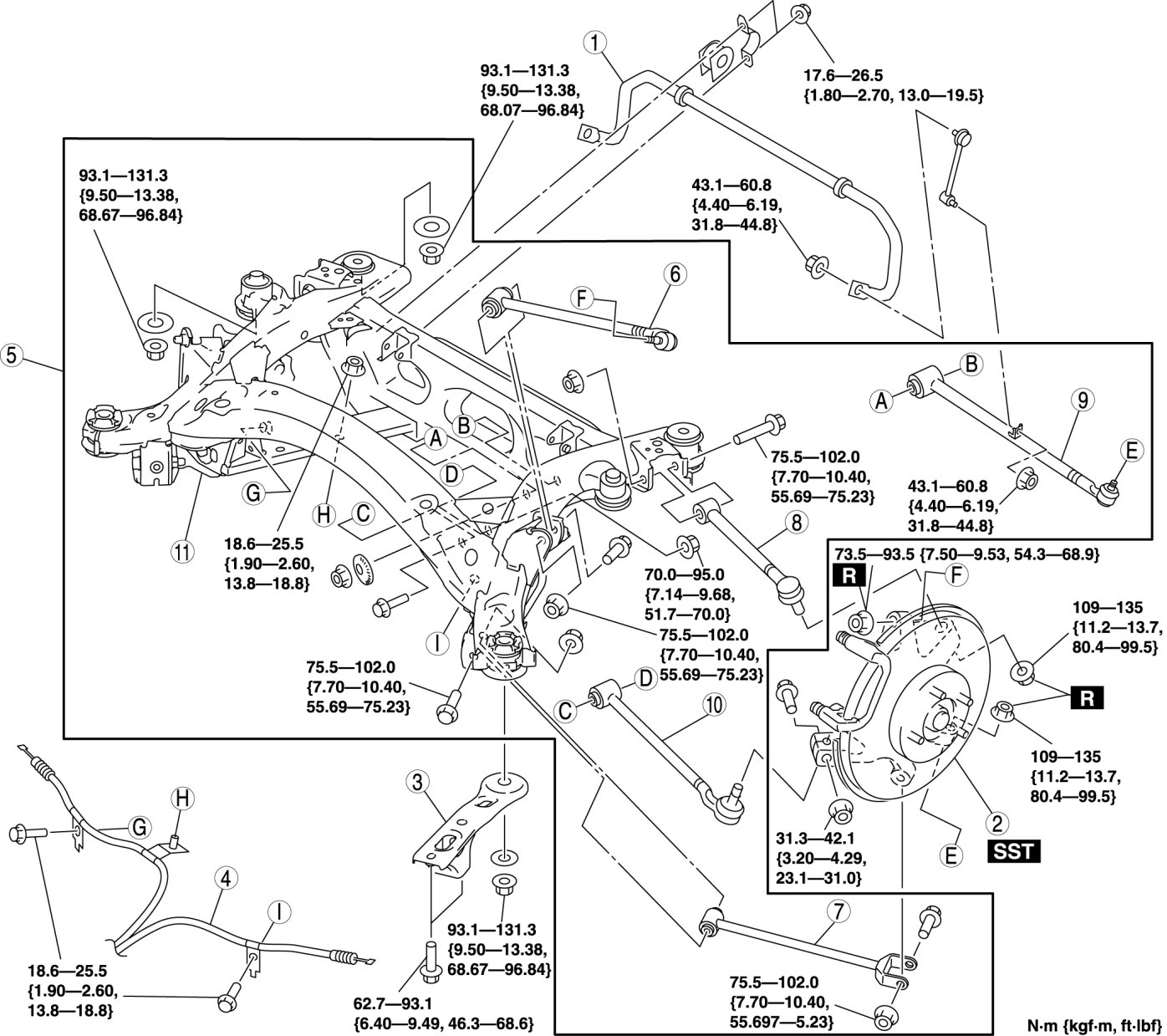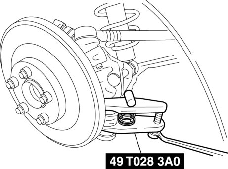 - Performing the following procedures without first removing the ABS wheel-speed sensor may possibly cause an open circuit in the wiring harness if it is pulled by mistake. Before operations, remove the ABS wheel-speed sensor (axle side) and move the sensor away from the harnesses.