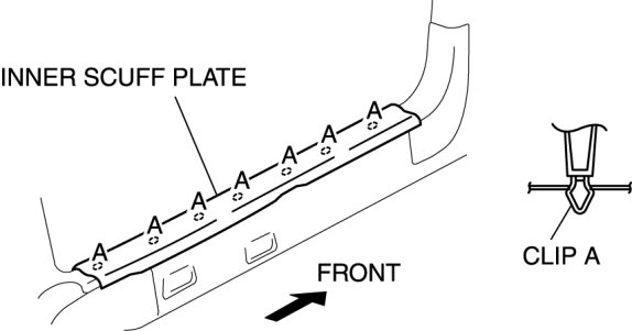 1. Pull the inner scuff plate upward, detach clips A from the body, and then remove the inner scuff plate.