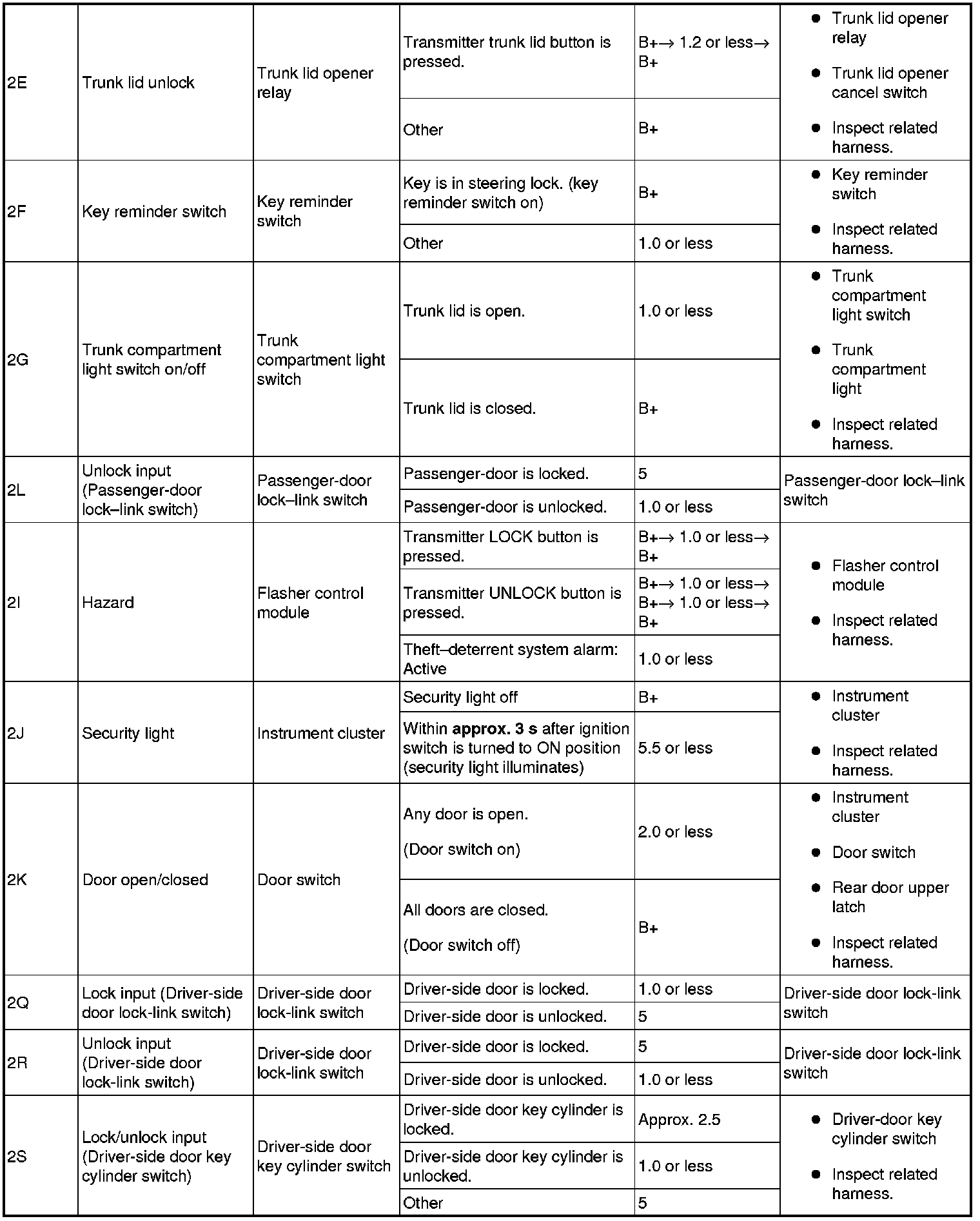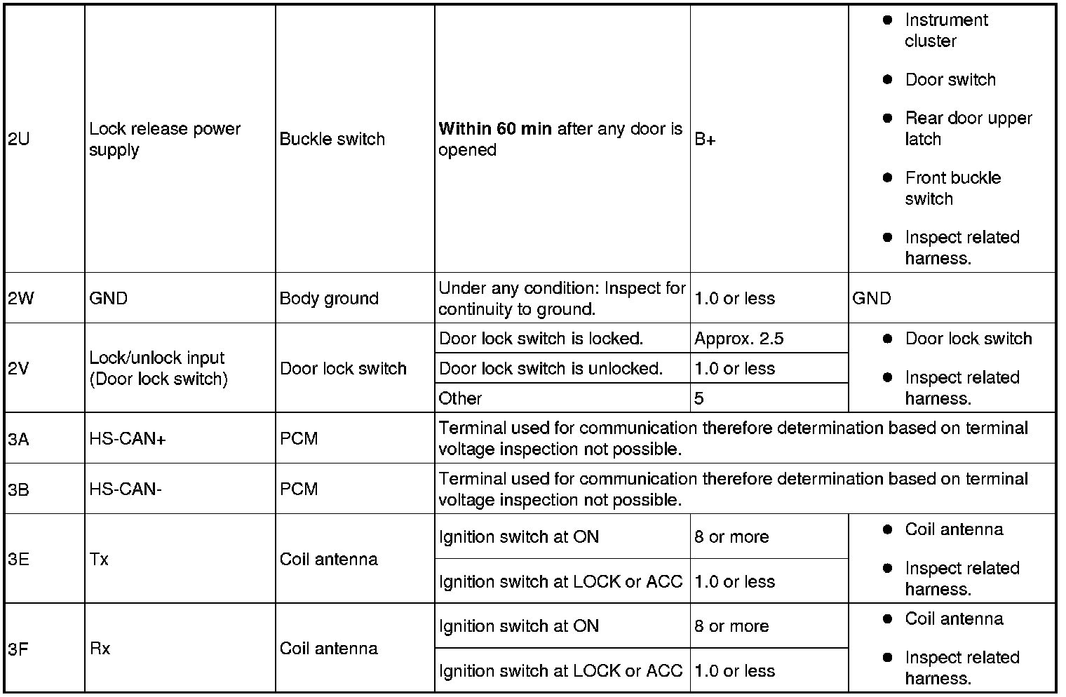 1. Measure the voltage or inspect for continuity according to the Terminal Voltage Table (Reference).