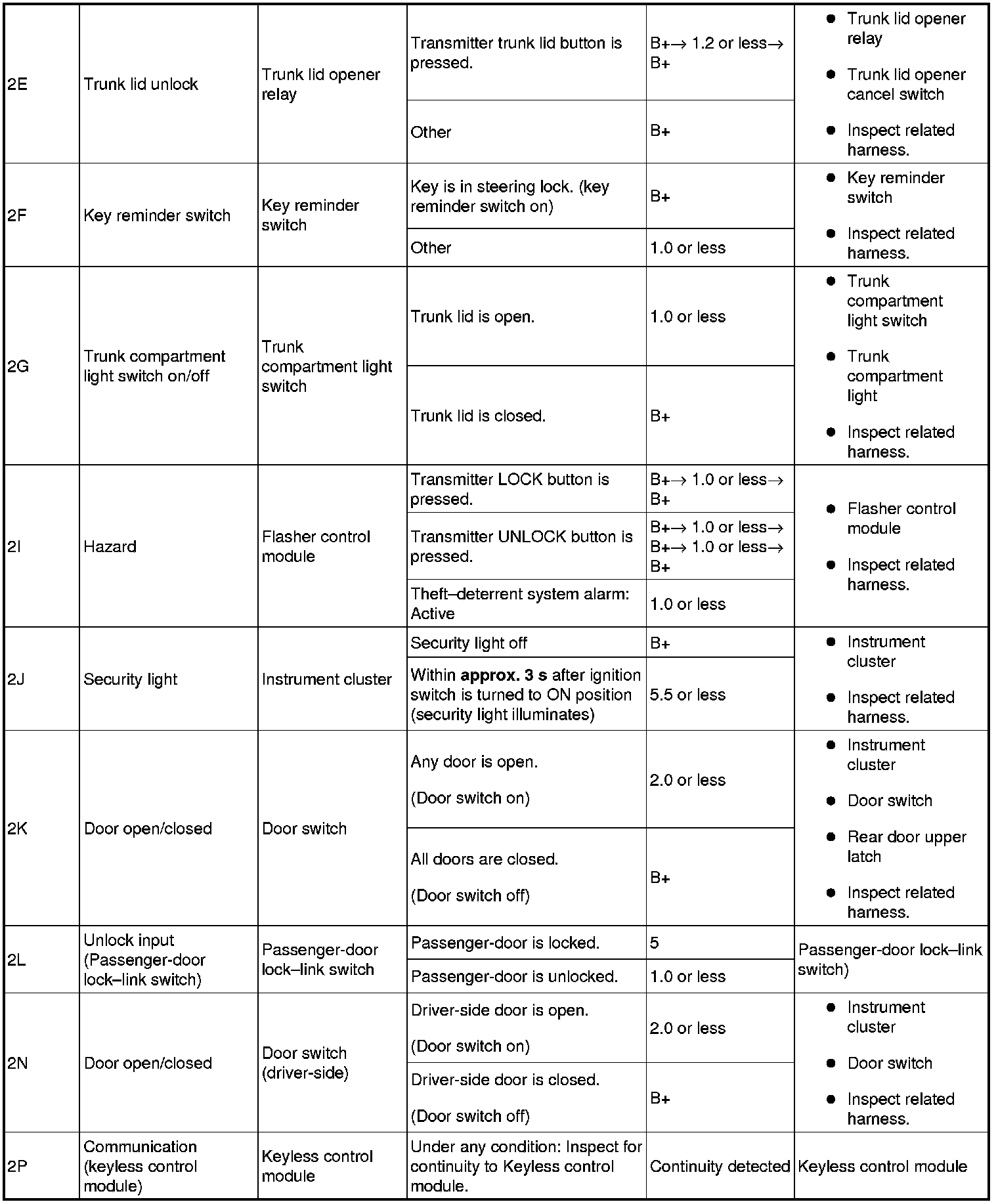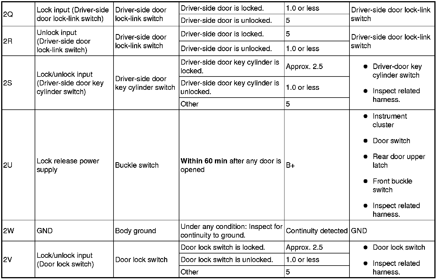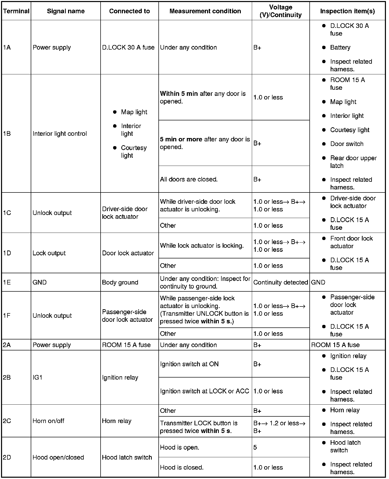 1. Measure the voltage or inspect for continuity according to the Terminal Voltage Table (Reference).