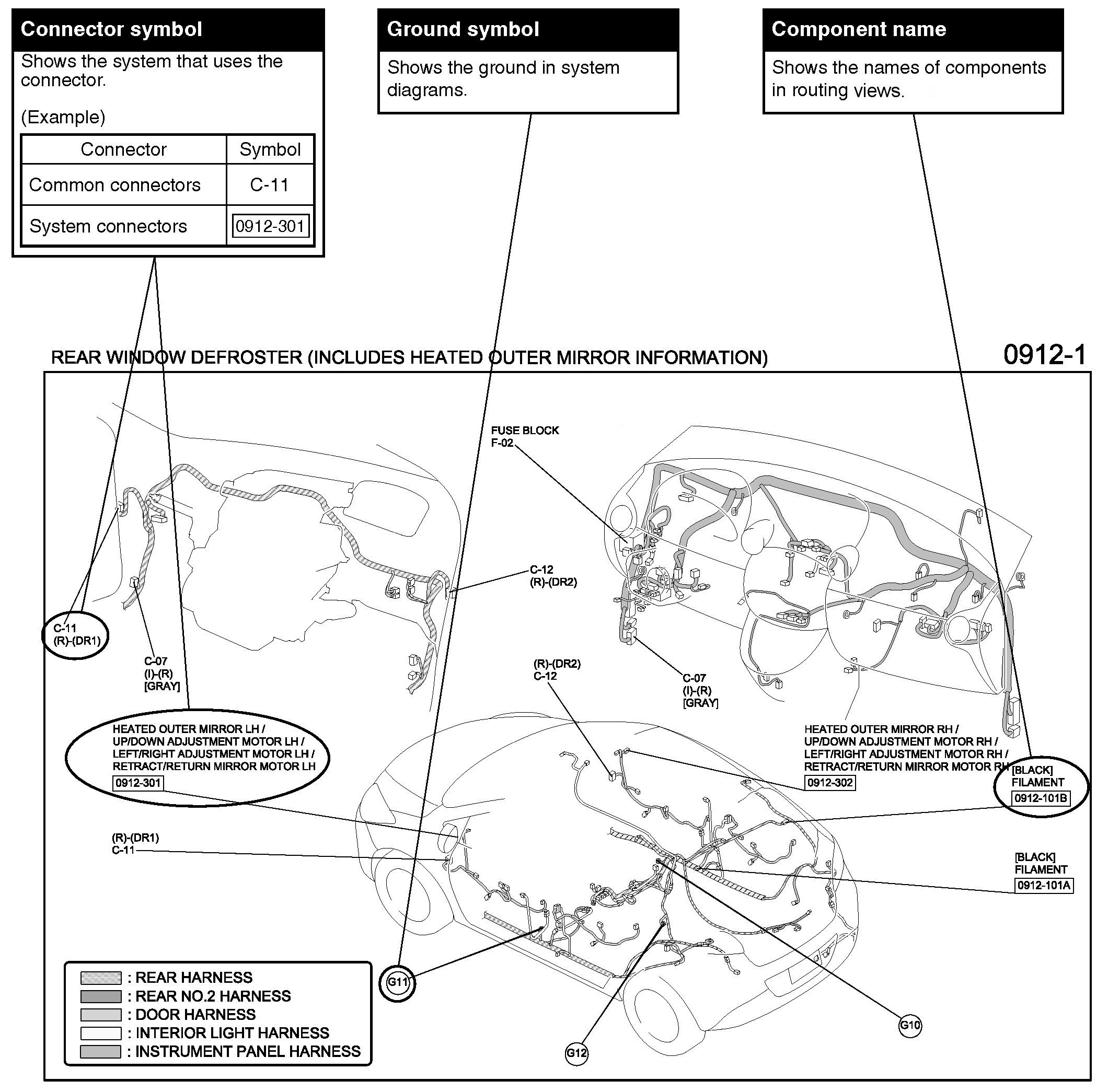 The routing view shows where electrical components are on the system circuit diagram by call out line and connector symbols.
