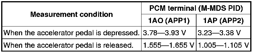 3. Verify that the voltage at PCM terminals 1AO (M-MDS PID: APP1) and 1AP (M-MDS PID: APP2) is as indicated in the table.