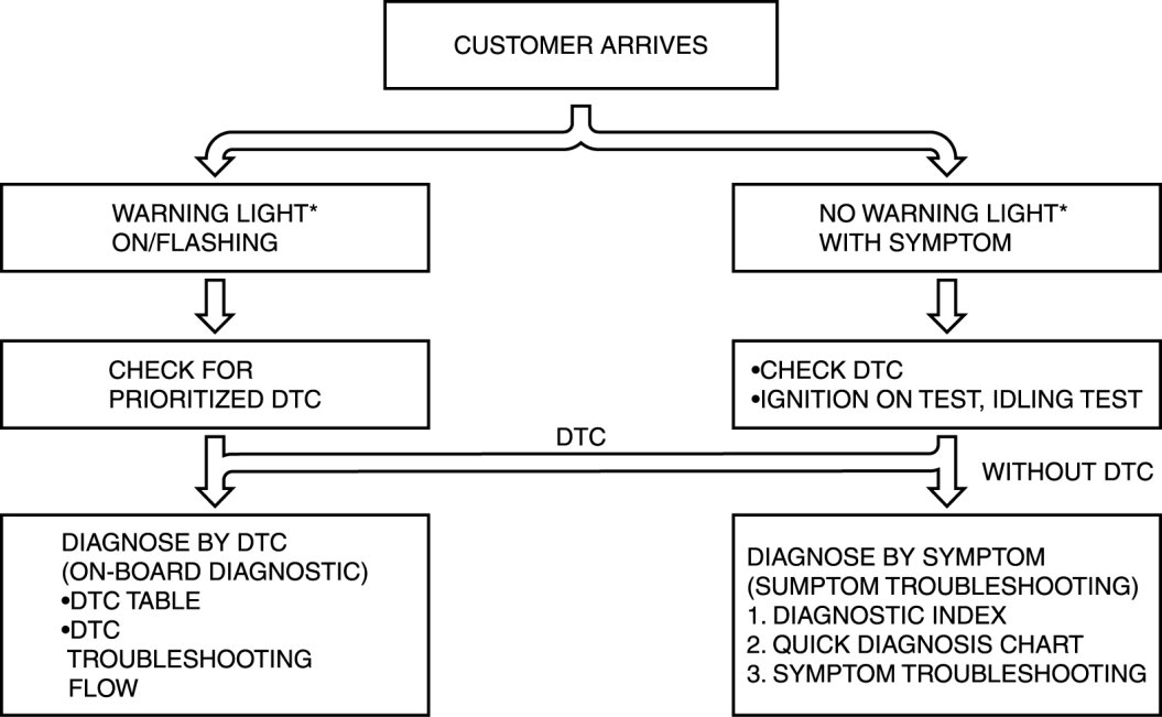- When the customer reports a vehicle malfunction, check the malfunction indicator lamp (MIL) indication and diagnostic trouble code (DTC), then diagnose the malfunction according to the following flowchart: